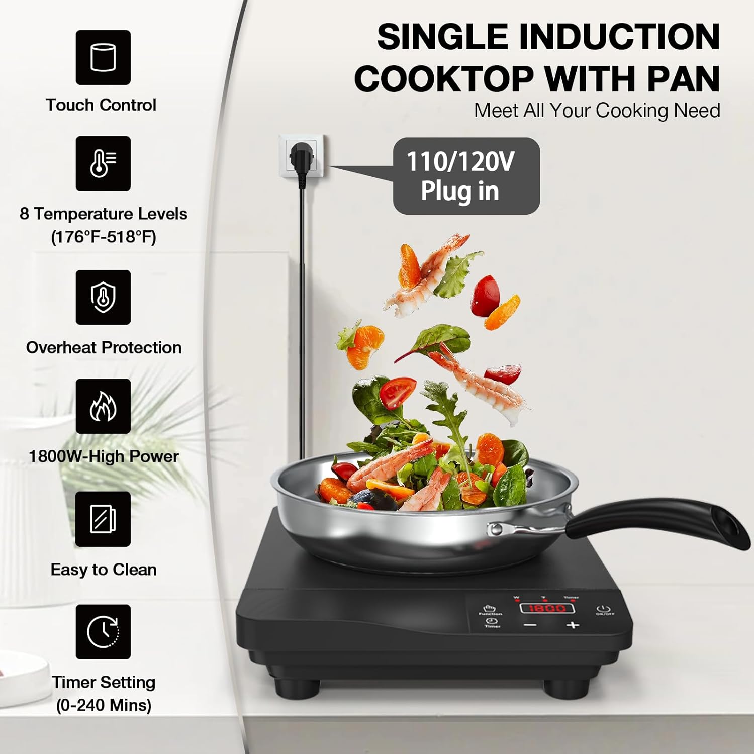 Portable Induction Cooktop 1800W,110V Single Burner Induction Burner & Fry Pan, Hot Plate Stove Electric Burner LED Touch Control & 4H Timer, 8 Power 8 Temperature Setting for Cooking