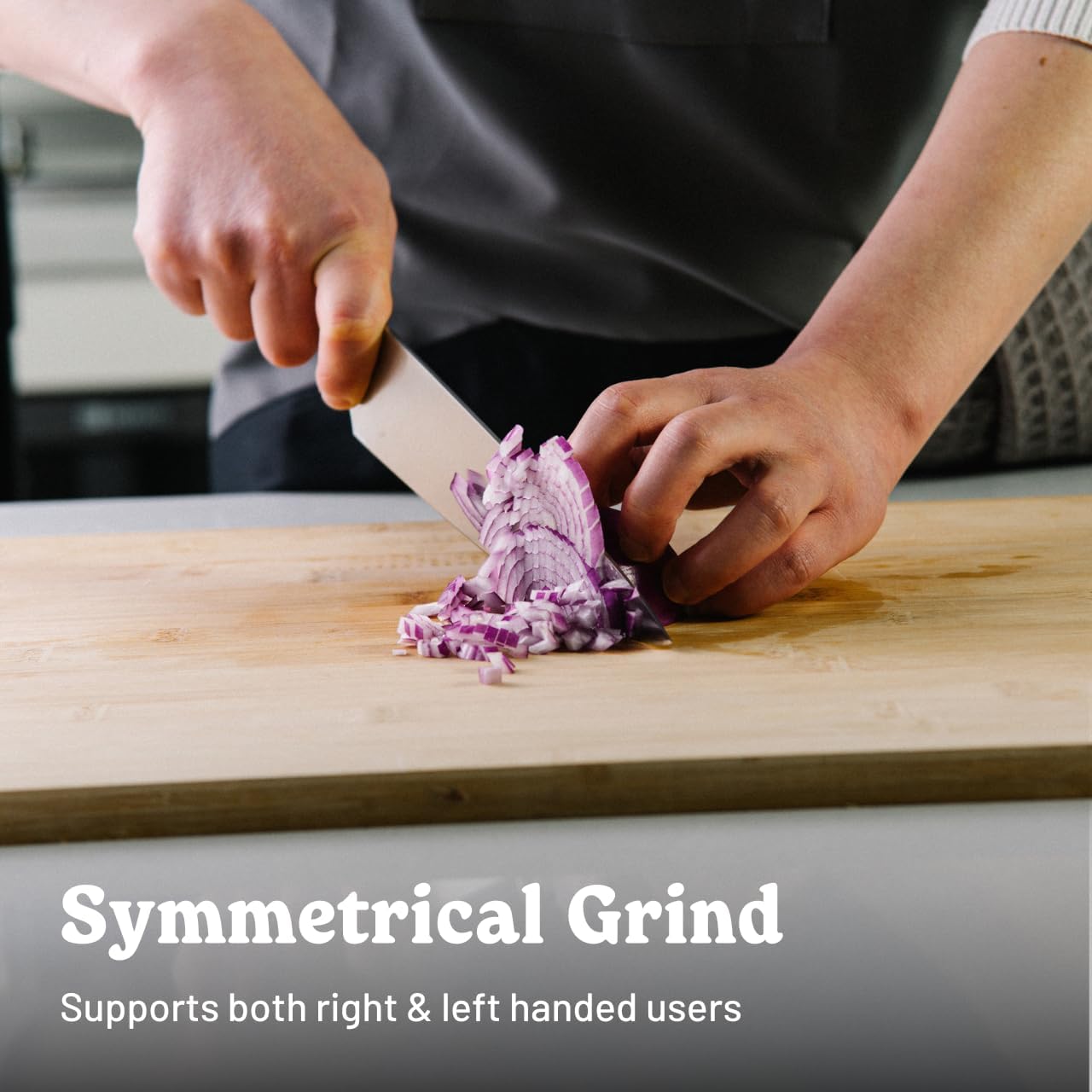 - Symmetrical 50/50 Grind: Enjoy the perfect balance with our knives, designed with a 50/50 grind. Balanced grind design supports both right- and left-handed users, providing superior control for all kitchen needs.