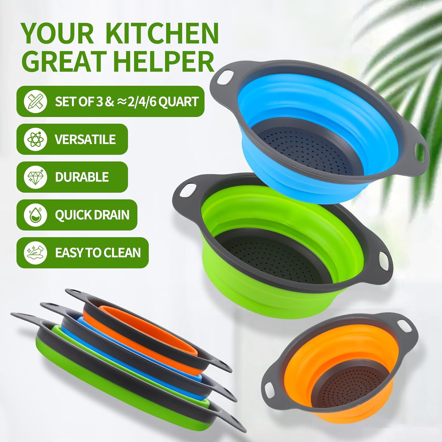 - [Squish Silicone Colander -Space-Saving Collapsible Colander Set]:Nest these 3 silicone collapsible colanders (6QT/4QT/2QT) like Russian dolls into a 2-inch disk! Perfect for tiny kitchens, they handle kale rinsing, quinoa draining, and blueberry washing—then vanish into drawers. Ideal foldable strainer for meal prep & cluttered countertops