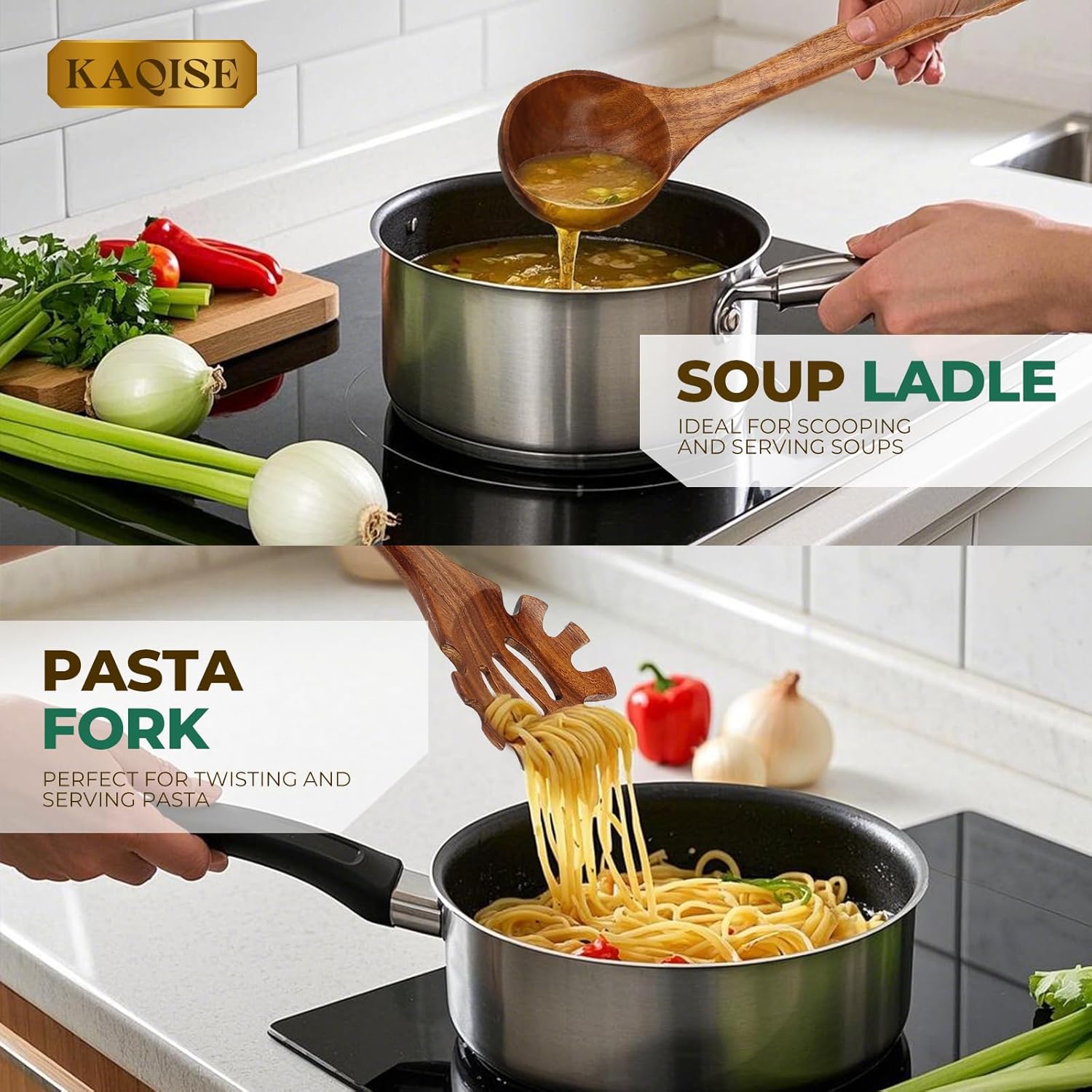 - 【Complete Wooden Kitchen Utensil Set】: This 2-piece set includes a Ladle and a Pasta Fork, carefully crafted to meet all your cooking and serving needs. Whether you're stirring soups, serving pasta, or dishing out sauces, this Wooden Kitchen Utensil Set offers the perfect tools for every task. We take great pride in our craftsmanship, ensuring each piece is made with attention to detail and quality.