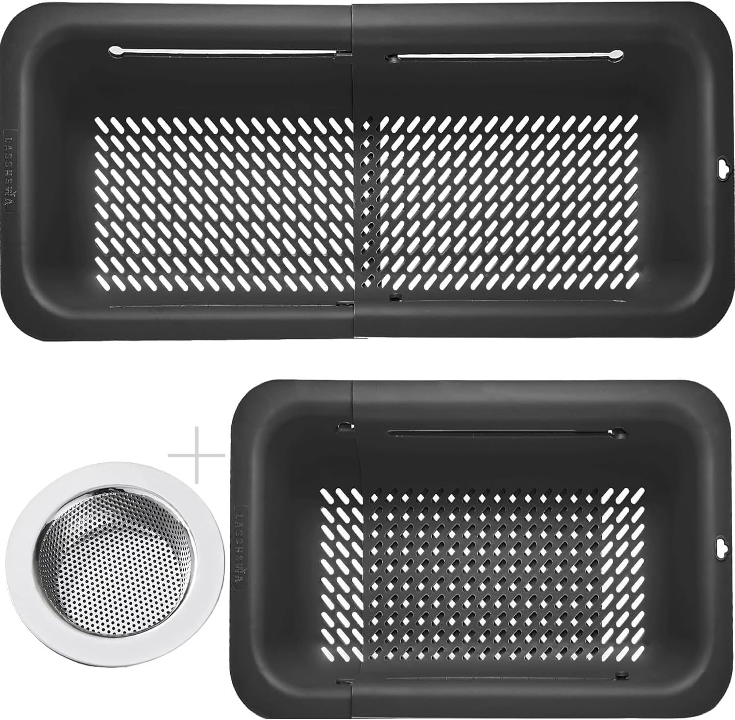 - LASSHSWA Over the sink extendable strainer, SIZE: 13-19 in (smaller space-saving design) . Stainless steel drain strainer, SIZE: Outer diameter: 4.5”; inner filter: 3”; depth: 1” . They fit for most kitchen sinks and drains.