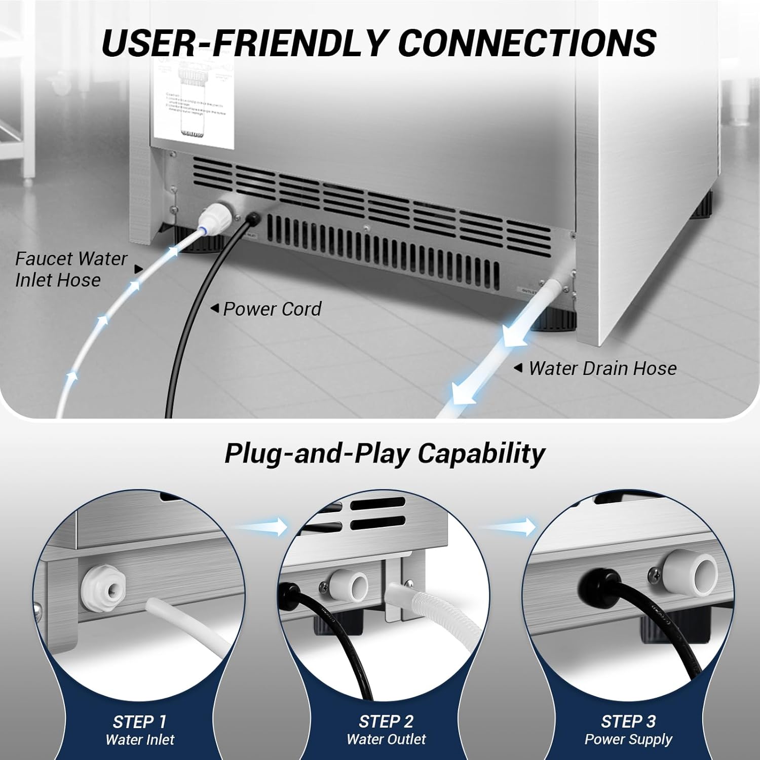 - Seamless Setup and Automated Operation: Get ice production underway in minutes with our all-inclusive ice maker. Automatic water filling and draining eliminate hassles, ensuring your machine is operational straight from the box.