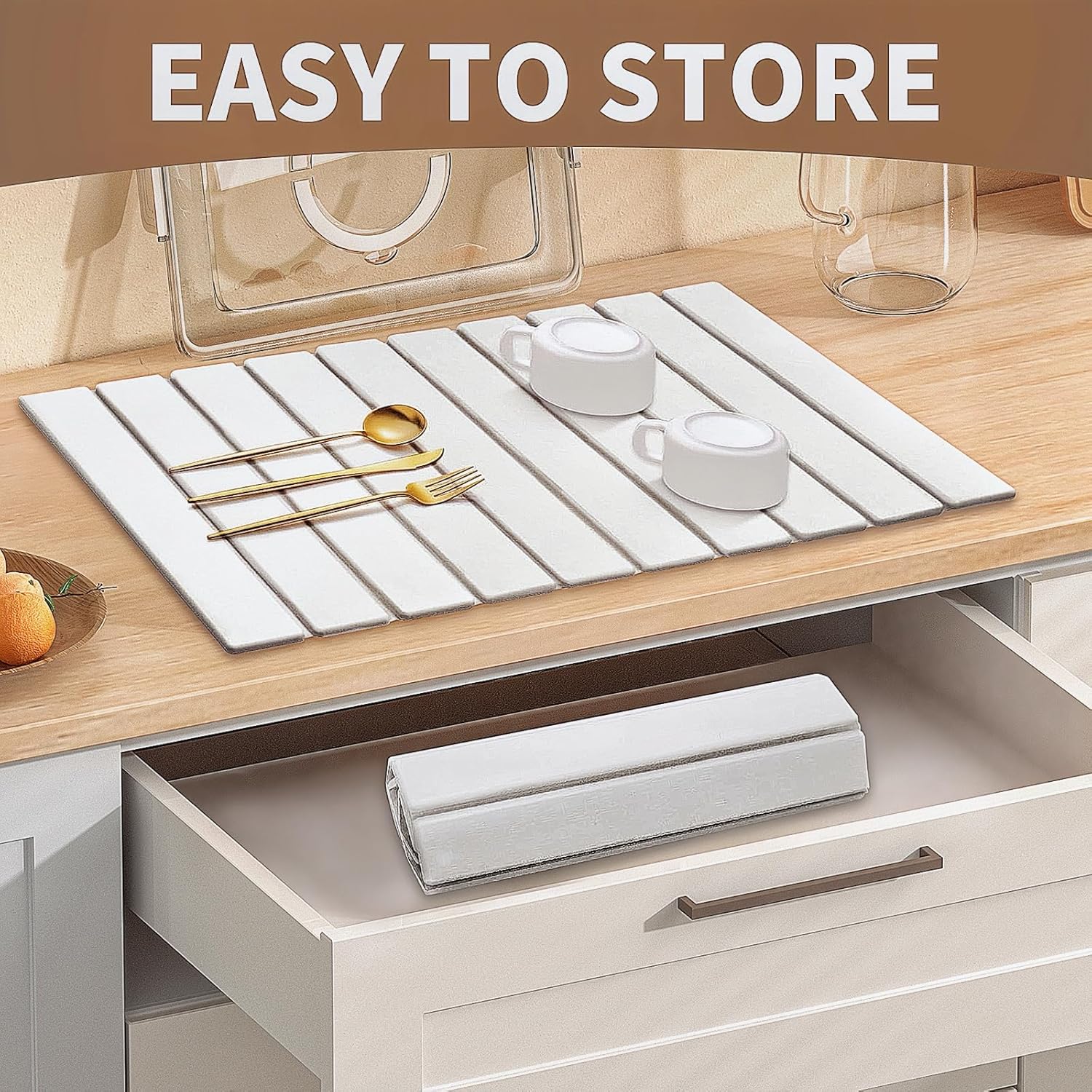 - Foldable Design for Convenient Storage: Quick dry dish mat is their simple and foldable design. When not in use, they can be easily folded and stored in a drawer or cabinet, saving valuable kitchen storage space. This compact, versatile option is ideal for those with limited countertop or storage room, making it a practical choice for any household