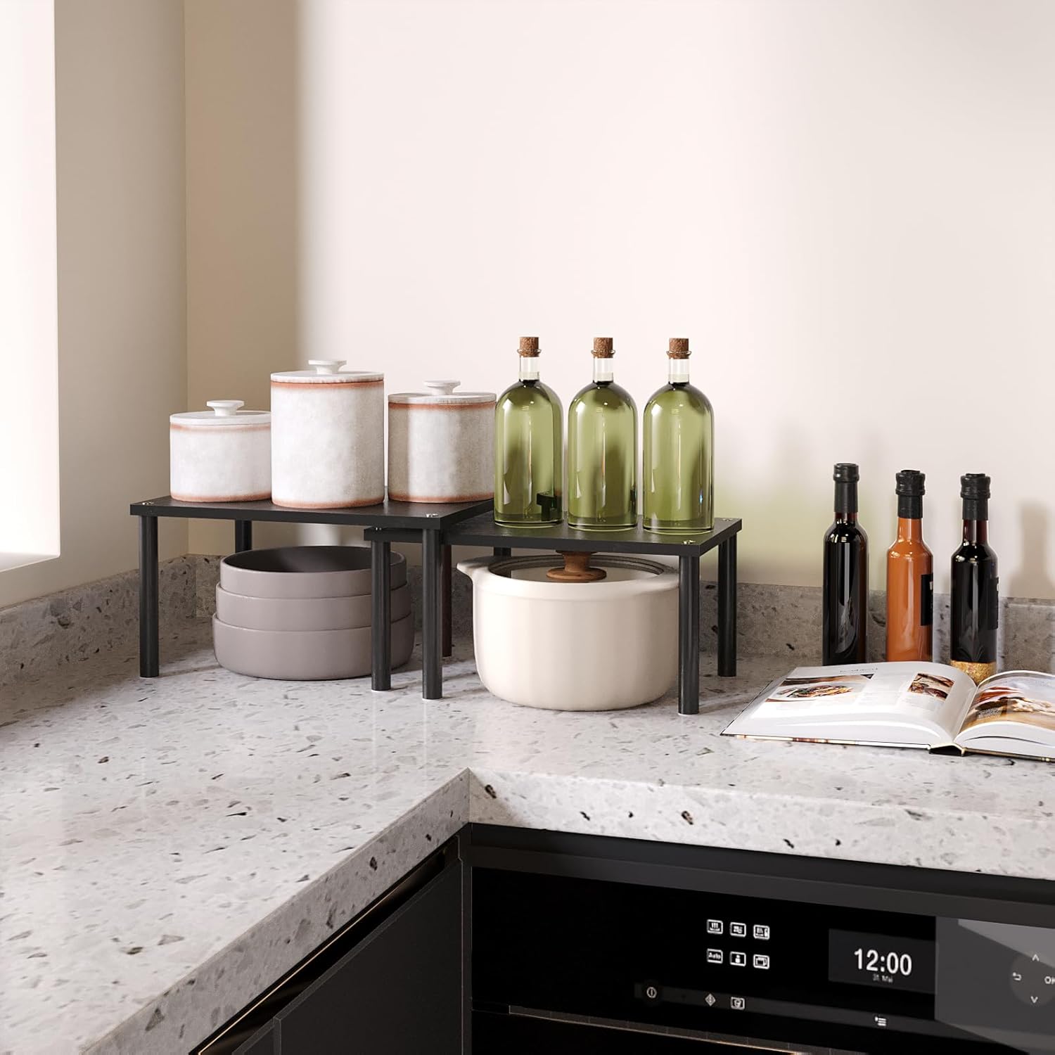 - 【Flexible Combination, Space Optimization】With their unique design, with one slightly smaller than the other, these shelf organizers can be stacked on top of one another, nested, used separately, or even in an L-shape.It is a flexible storage solution that transforms your kitchen into a more organised and tidy space.