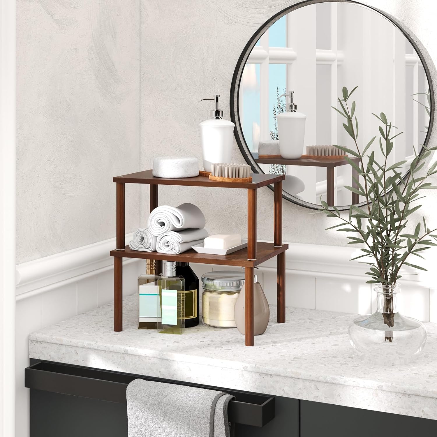 - 【Sturdy Round-Bar Design, Load-Bearing Reliability】Featuring 0.59 inch reinforced round bars, this rack not only looks aesthetically pleasing but also ensures exceptional load-bearing capacity. Whether placing heavy bottles or lightweight spice packets, it remains stable and, giving you peace of mind.