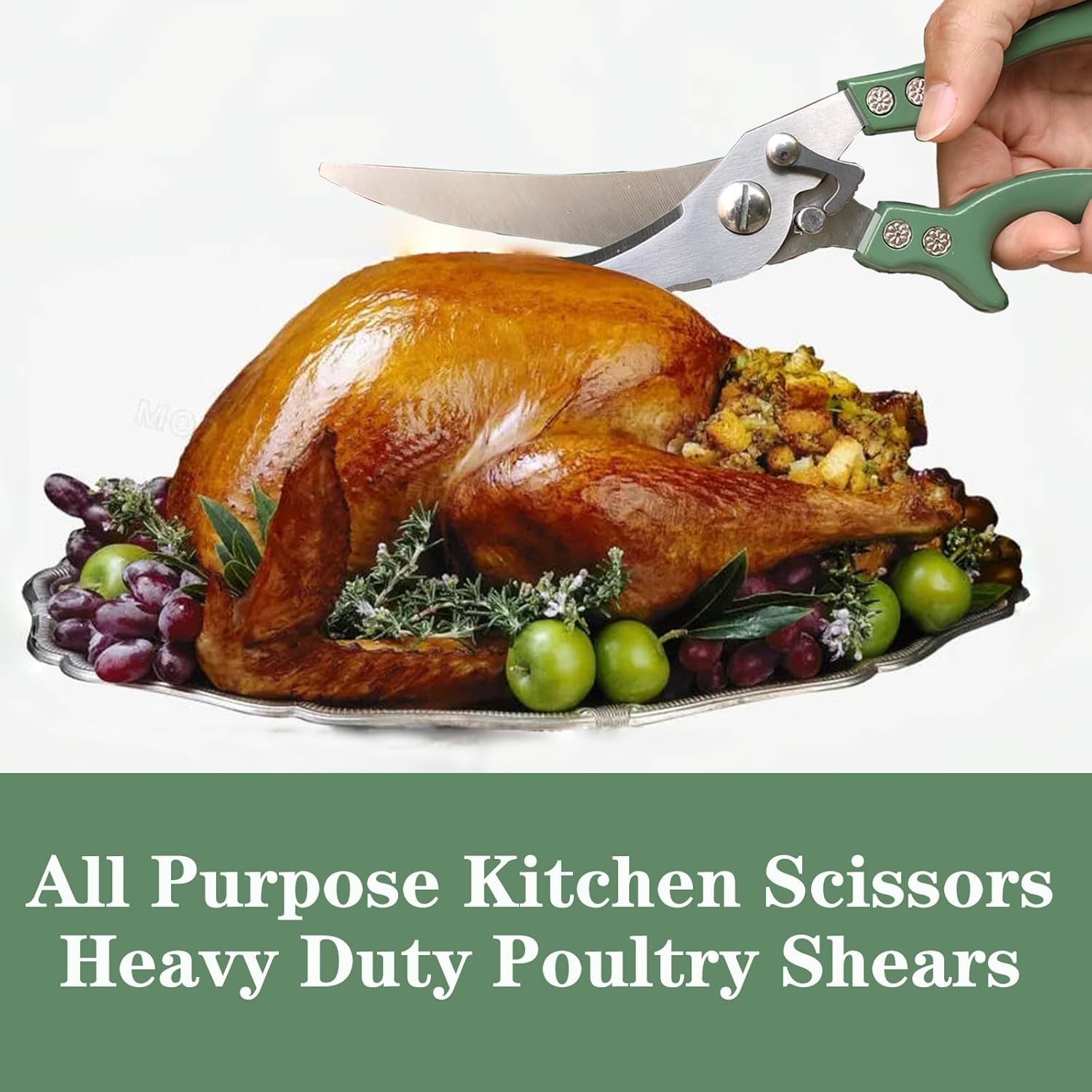 - Heavy-Duty kitchen shears:Crafted from high-quality materials,Crafted with durable antirust stainless steel blades. These green heavy duty kitchen shears are built to last, ensuring reliable performance for years to come. Upgrade your kitchen experience with our heavy-duty poultry shears designed for effortless cutting and trimming of poultry, meat, and other food items. These versatile all-purpose kitchen scissors boast sharp, durable blades that slice through tough materials with ease.