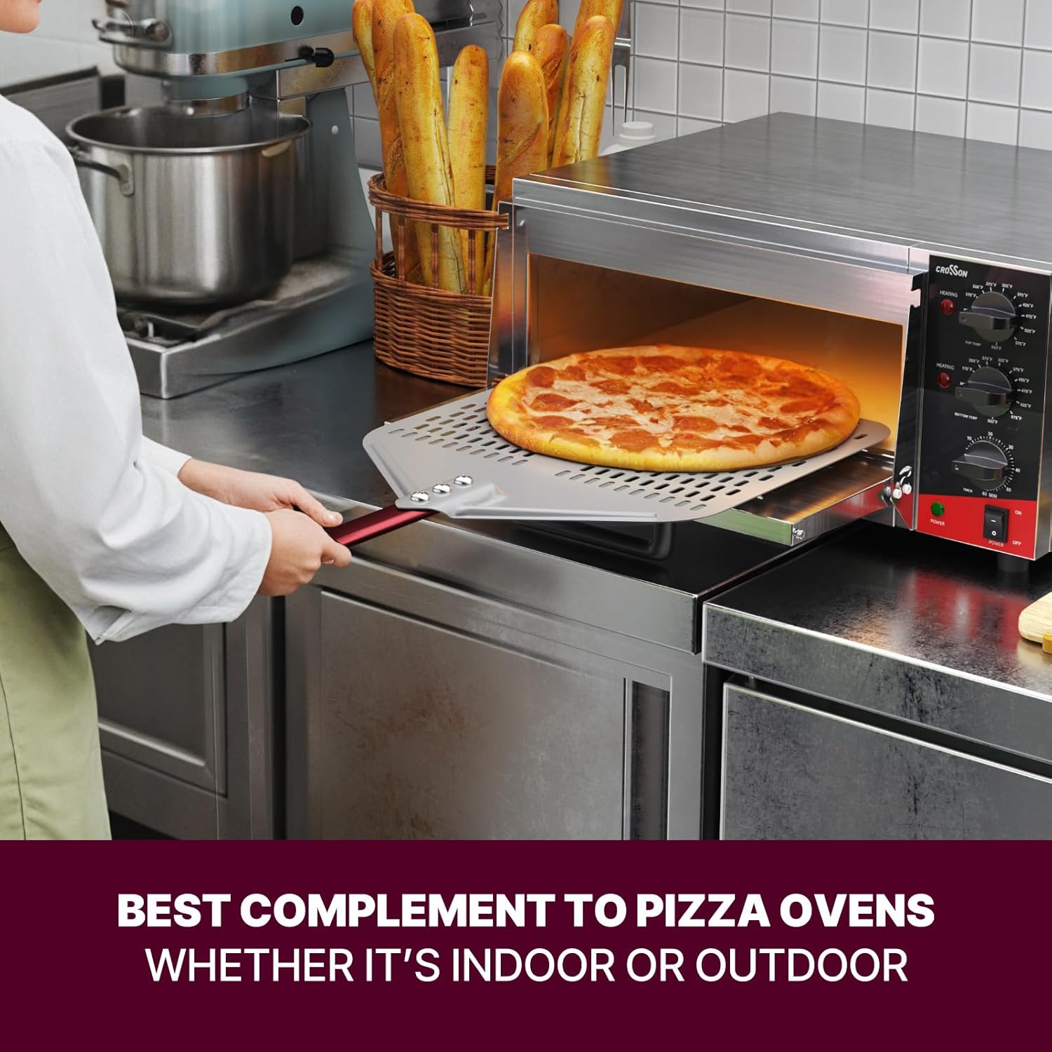 - Non-stick Pizza Peel: The unique perforated and coating created by hard anodizing process allow enhanced air circulation . As a result, your pizza won't stick to the peel, and the bottom stays delightfully crispy.