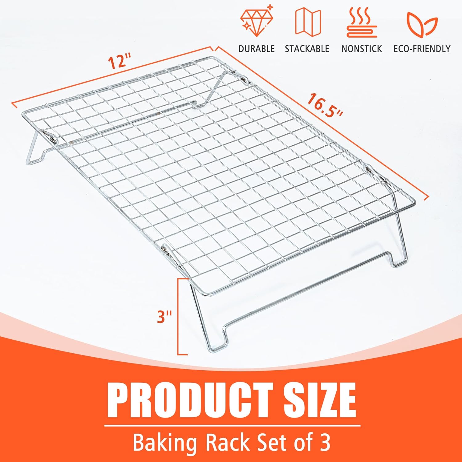 - OVEN-SAFE & HALF SHEET PAN COMPATIBLE: Each baking rack measures 12” x 16.5” and fits perfectly in half sheet pans. They are oven-safe, enabling you to stack and bake multiple layers of cookies or meat