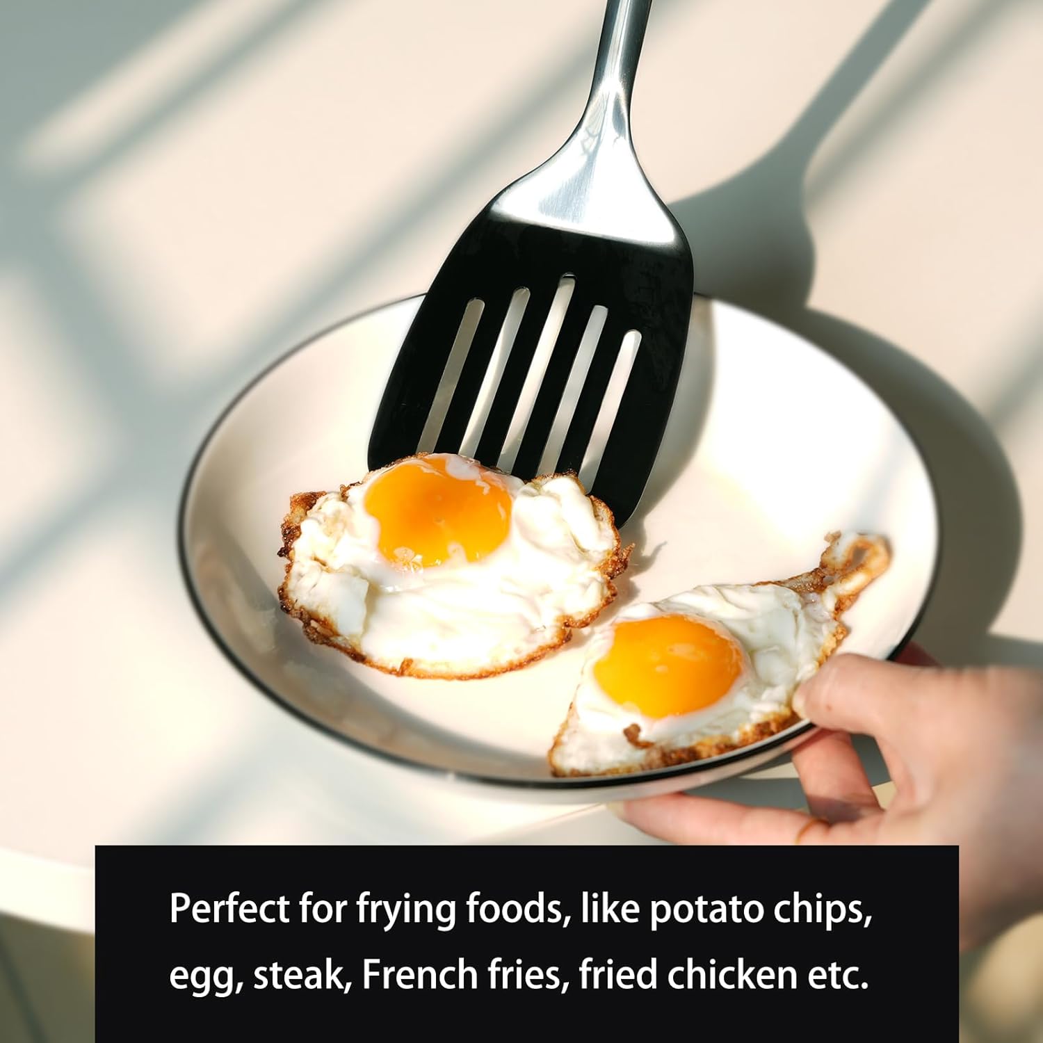 - Slotted Spatula Design: This stainless steel spatula with drainage slots make draining quick which is perfect for frying foods, like potato chips, French fries, fried chicken etc. The perfectly proportioned slots is great liquid flow when straining or draining food.