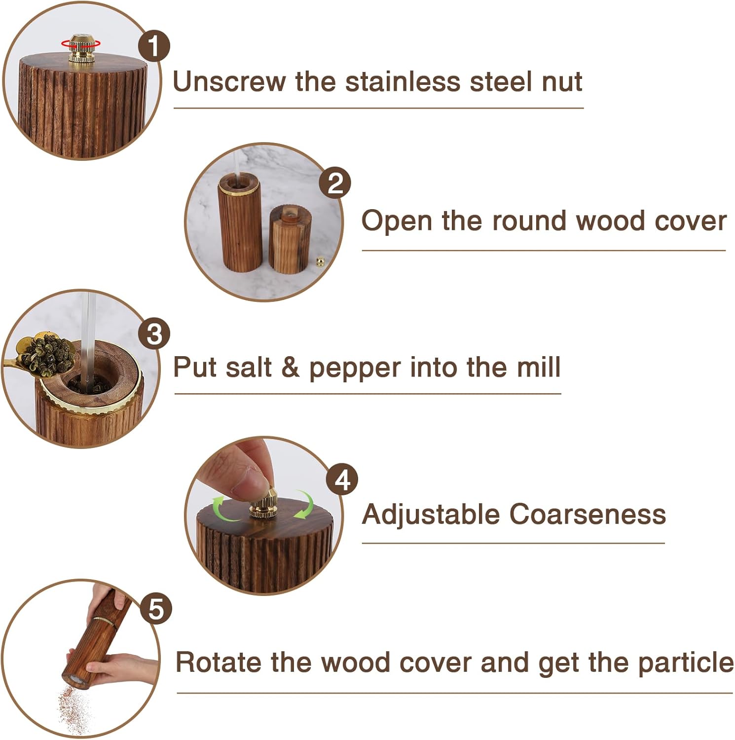 - Natural Wooden Design: This salt and pepper grinder set Crafted from premium-grade Acacia Wood, this 8.3-inch salt and pepper grinder set combines durability and style, complementing any kitchen or dining table decor. Whether you're seasoning your favorite dishes or showcasing them as a centerpiece on your table, these grinders are built to impress.