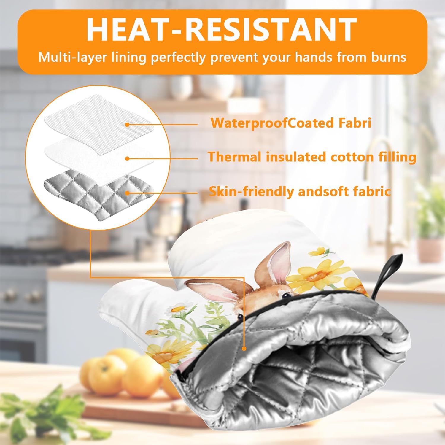 Easter Rabbits Oven Mitts and Pot Holders Sets 4Pcs,Extra Long Oven Gloves Potholder for Kitchen Cooking Baking BBQ 100% Cotton Heat Resistant