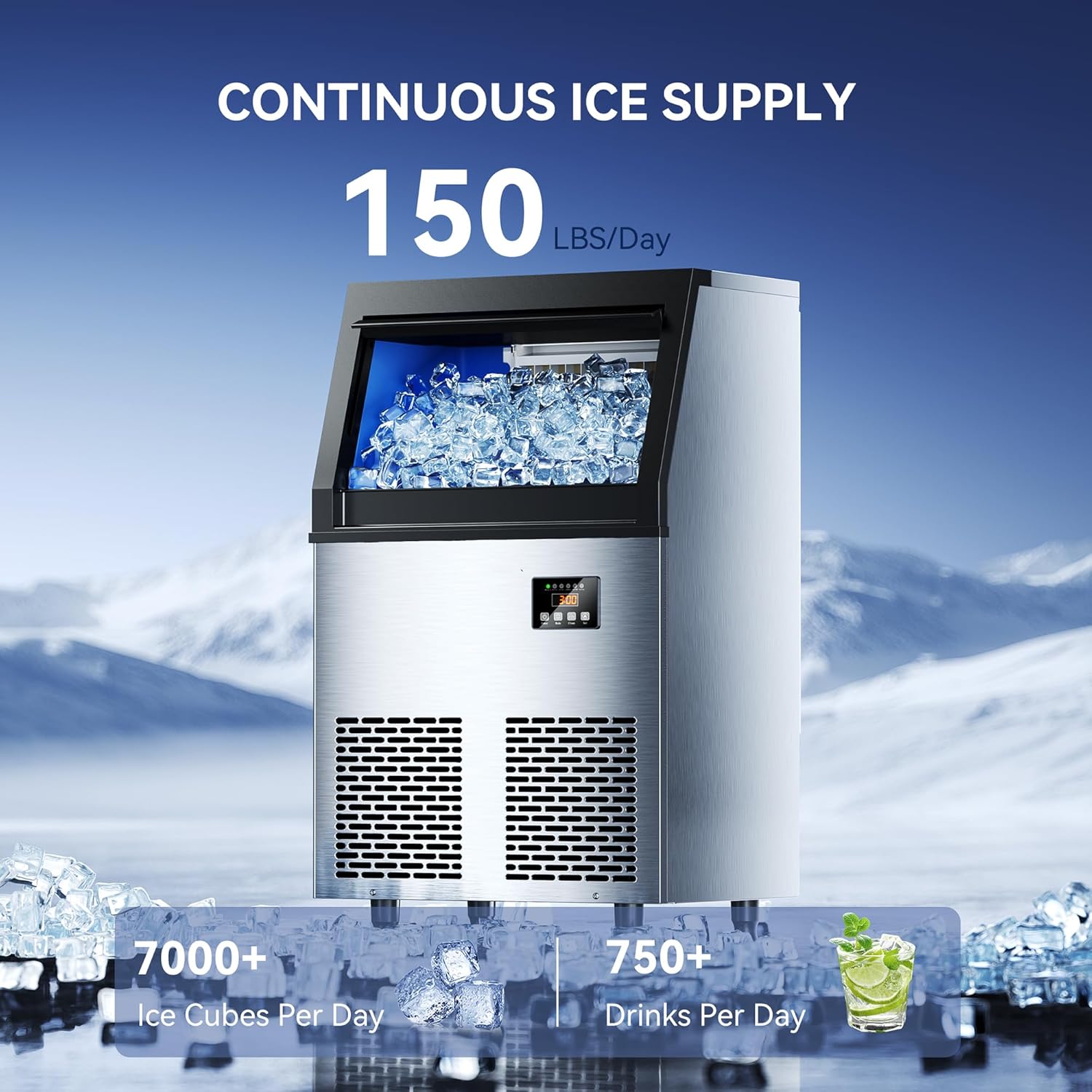 - Efficient & Quiet Ice Production: The ice maker commercial with a capacity of 45 ice cubes and up to 150 lbs of ice production per day, it fits perfectly in various settings like home, coffee shop, bar, etc. The 35 lbs storage capacity is also quite generous. Operates quietly, so you can enjoy cold refreshments without the disturbance of excessive noise.