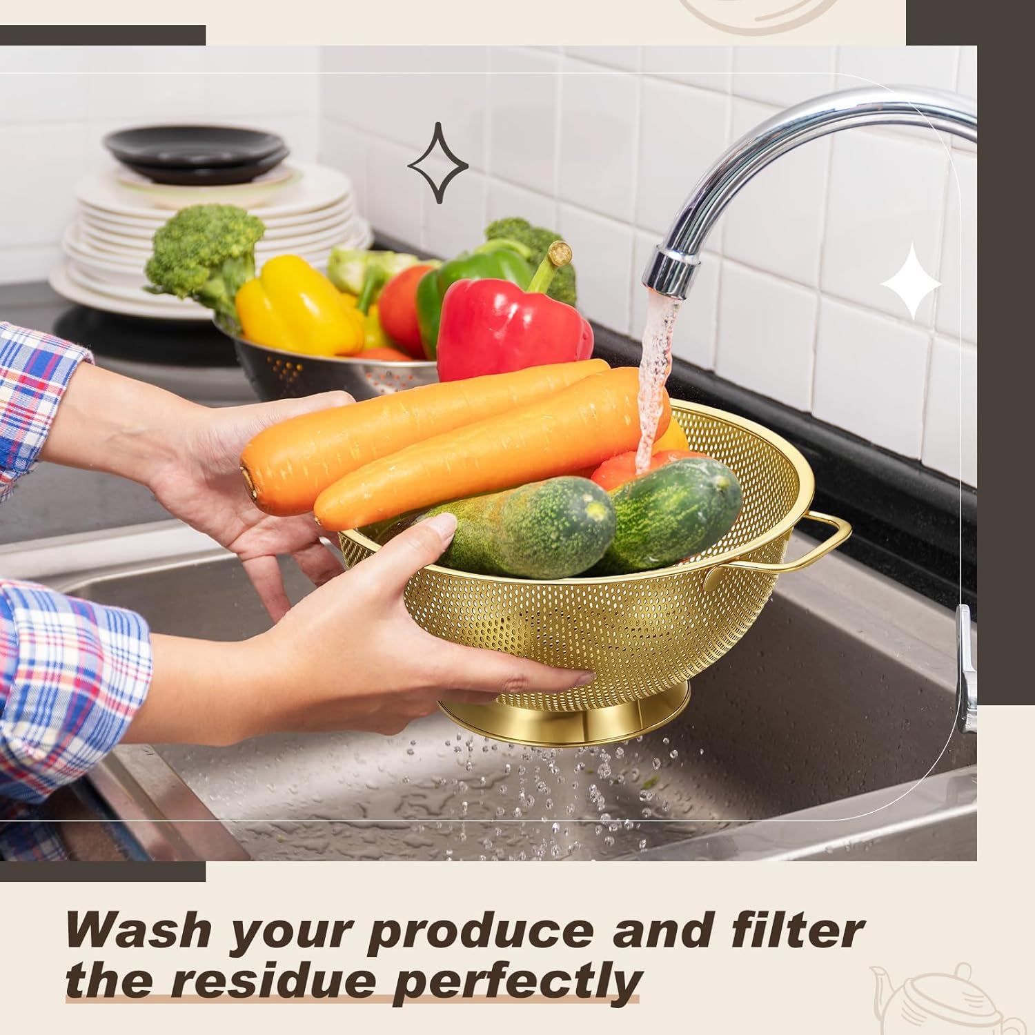 Norme 4 Quart Stainless Steel Gold Colander and 3 Pcs Gold Fine Mesh Strainer, Stainless Steel Pasta Rice Food Metal Strainer with Handles, Easy Clean and Dishwasher Safe