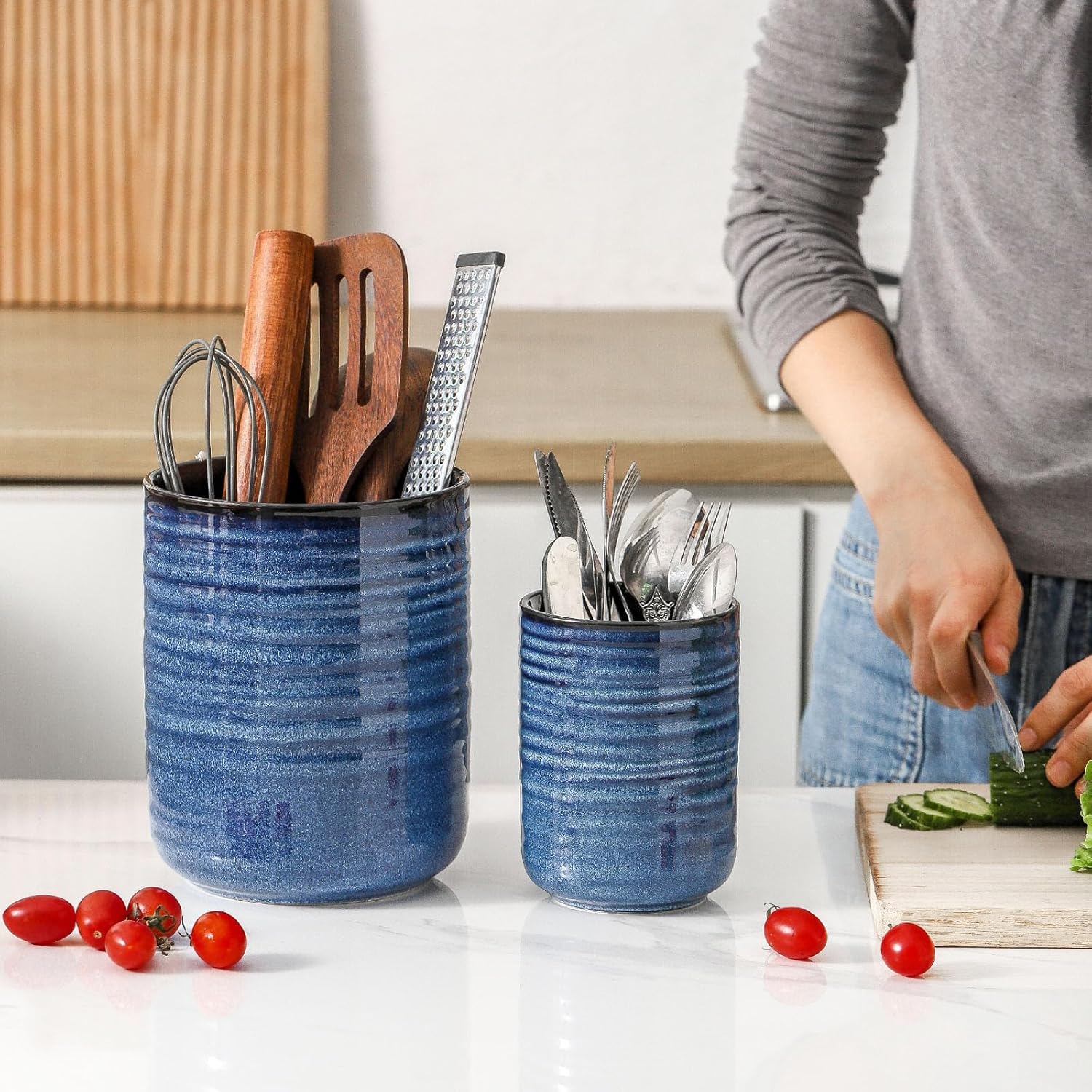 - Attractive Gift: Hasense blue ceramic utensil crock set comes in two size that is the ideal present for home, restaurant and kitchen cooking enthusiastic at housewarming, wedding, birthday, Mother’s Day, Thanksgiving, Christmas and New Year. The navy utensil caddy is perfect for your family