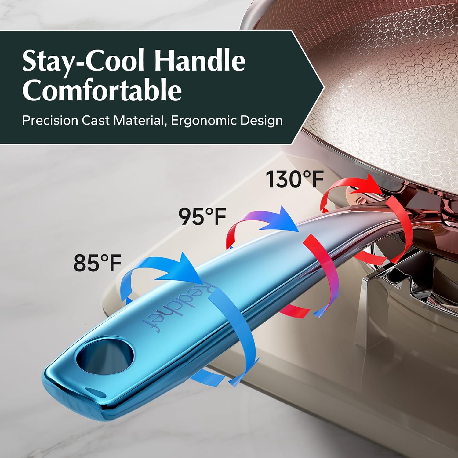 - Stay-Cool Handle: Redchef non stick frying pans with a comfortable ergonomically designed grip; Cast Stainless Steel Handle remains cool to the touch while low heat cooking more enjoyable experience