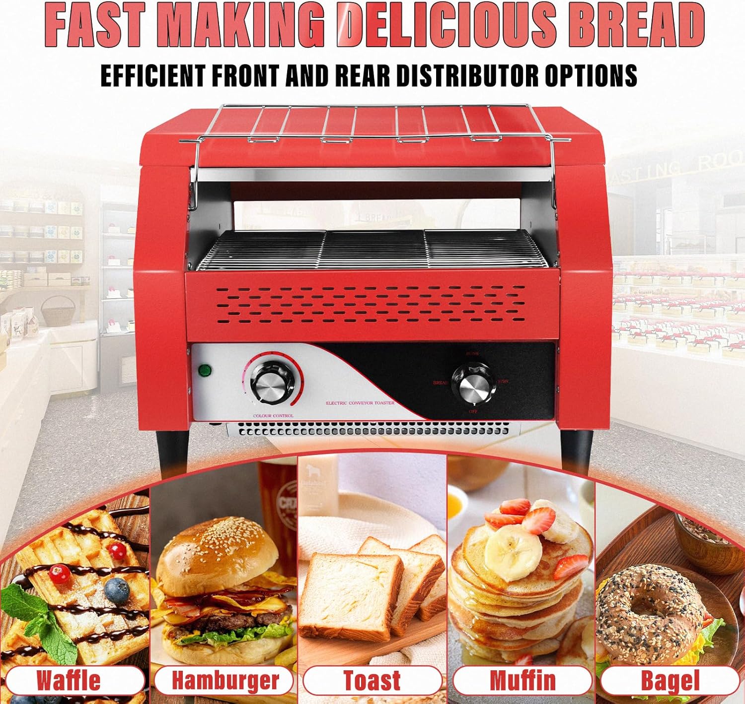 Commercial Conveyor Toaster 450 Slices/Hour Red Conveyor Toaster 3 Modes/7 Speeds Stainless Steel Tabletop Toaster for Toast, Bagels and Other Baked Breads