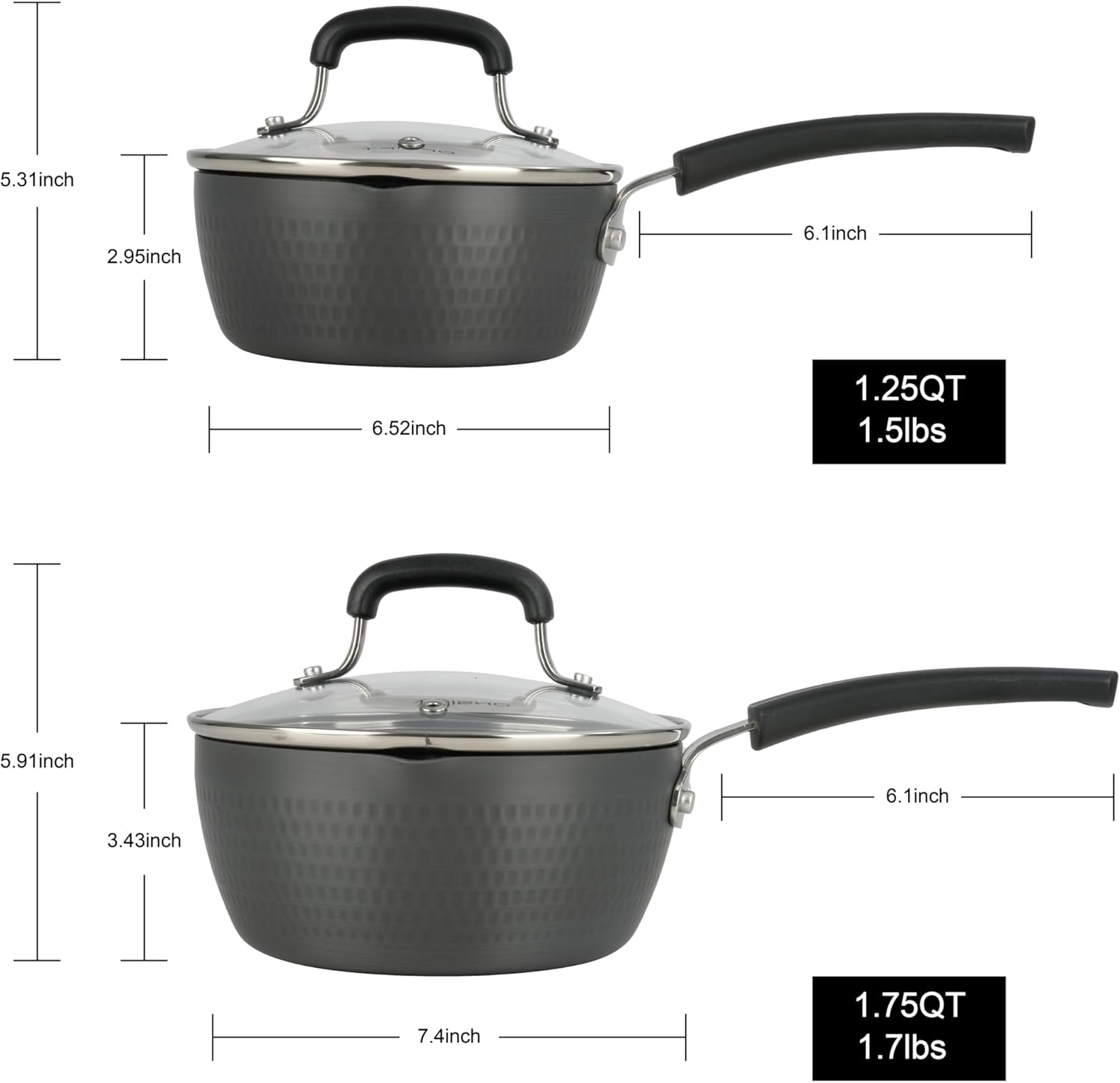 - Size:The sauce pots come in three different sizes: 1.25QT/1.75QT/2.4QT, catering to your various food preparation needs. Whether you're boiling pasta, making sauce, preparing meats, or stir-frying leftovers, these frying pans can do it all