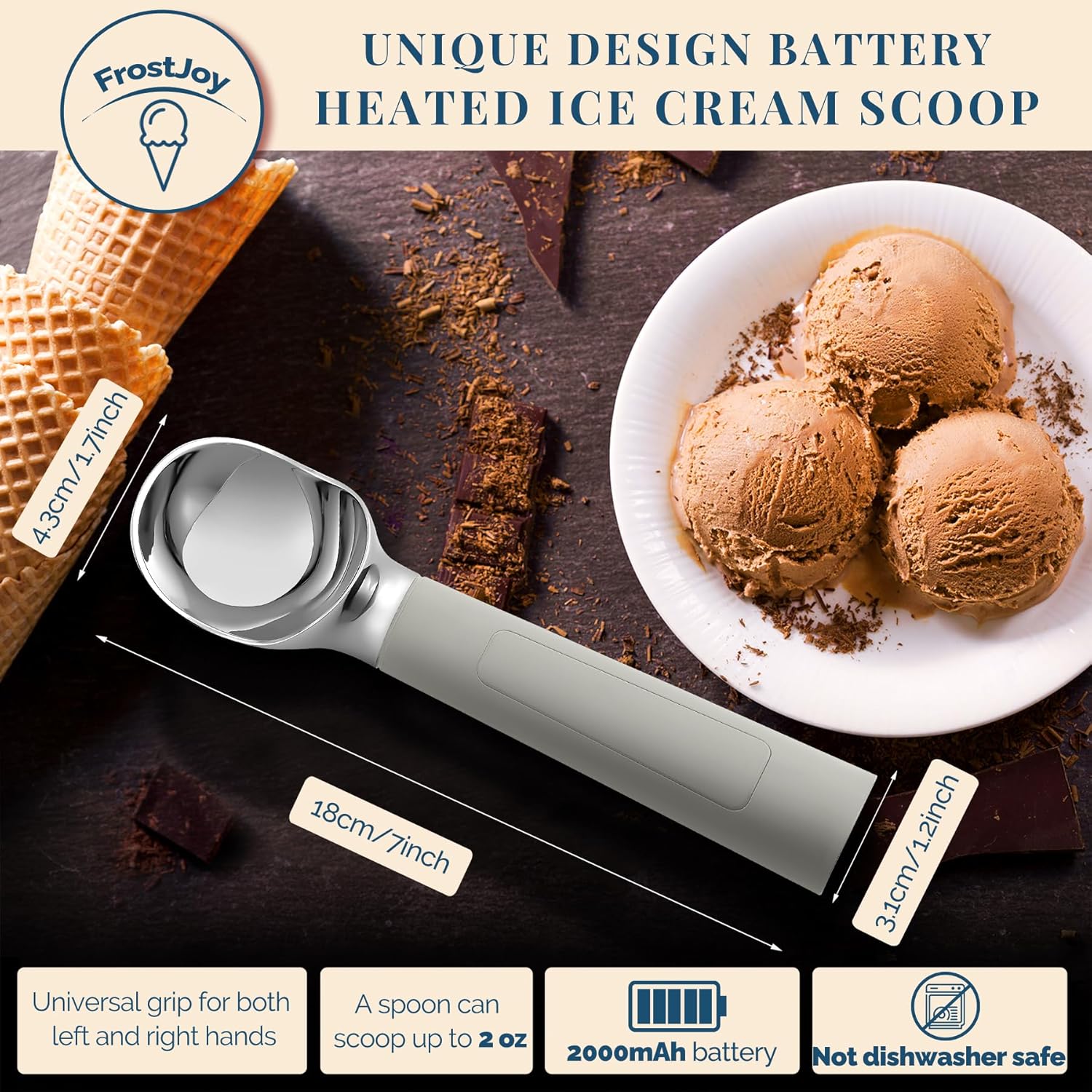 - [Effortless Hard Ice Cream Scooping] – No more bending spoons or waiting for ice cream to thaw. This heated ice cream scoop warms up quickly to 158°F, letting you glide through even rock-solid ice cream straight from the freezer. Just grip the handle to activate heating — no buttons required. It continues warming for 40 seconds after use, making every scoop smooth and simple. Perfect for ice cream, gelato, or frozen yogurt