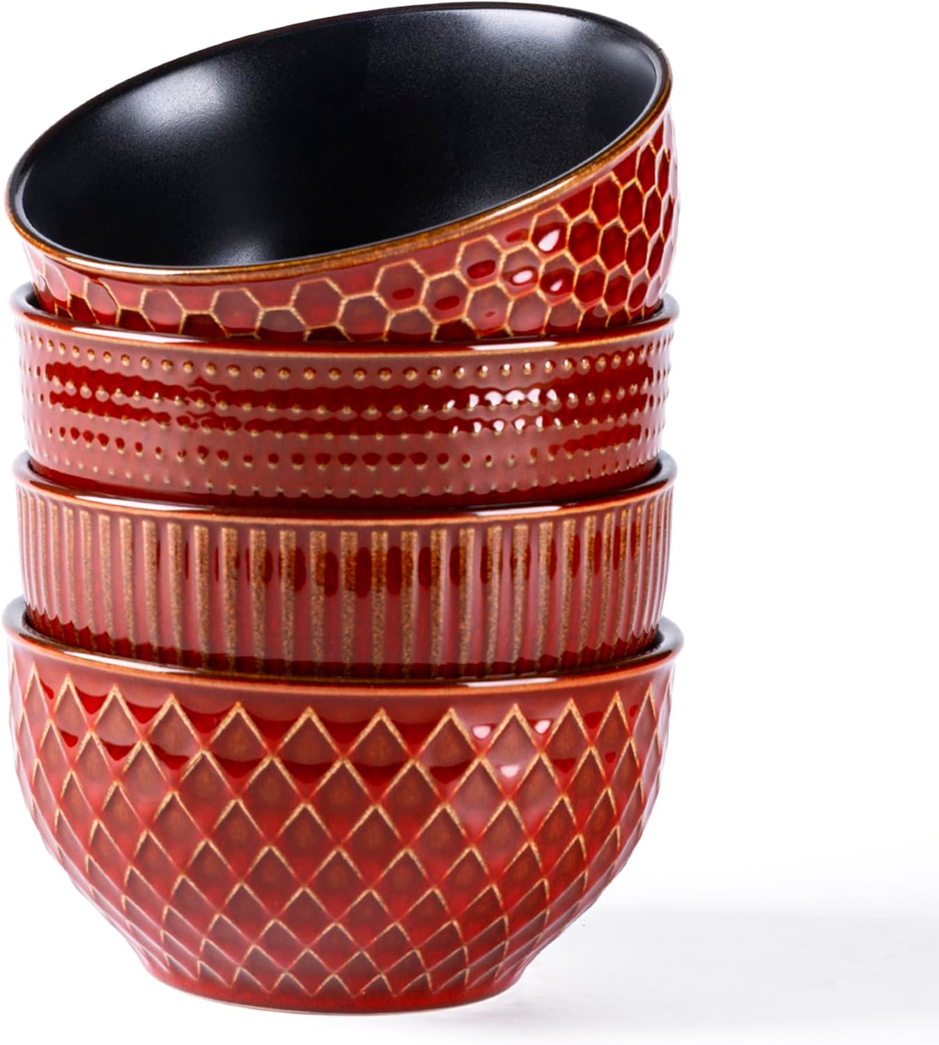 GBHOME Stoneware Cereal Bowls Set of 4, 24 oz Ceramic Soup Bowls with Texture Patterns for Soup,Oatmeal,Snack Perfect for Wedding, House-warming Gift -Rythmic Red