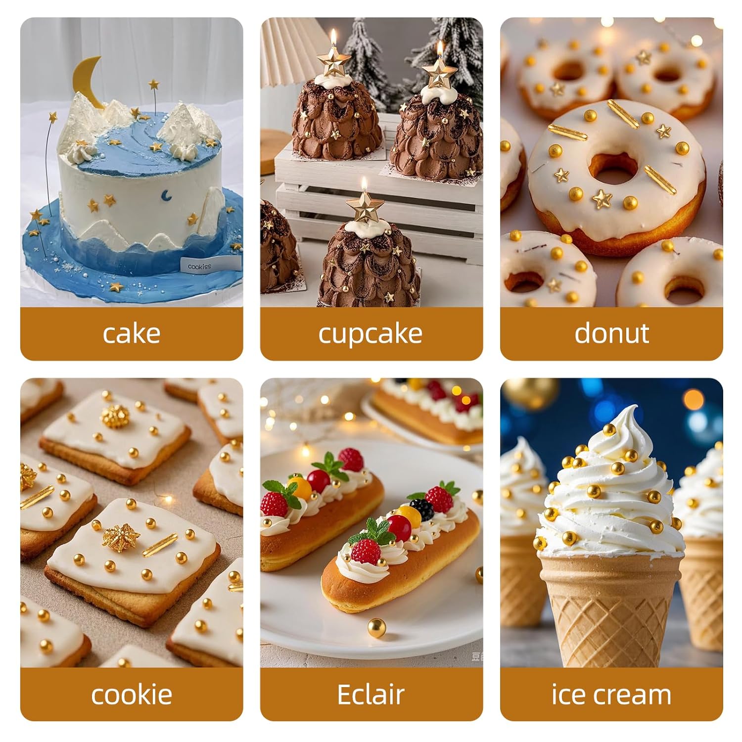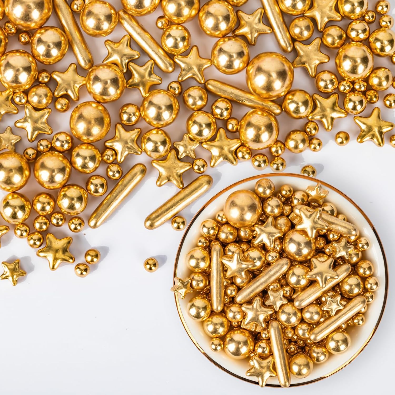 - Versatile Dessert Decoration: Our sprinkles includes different sizes of gold beads and golden Rods stars,perfect for meeting all your baking decoration needs.The sugar decorations are edibled candies. It is normal for large candies to have a hard texture and can be eaten with confidence.After baking, decorate the cookies or cake with pearl sugar to avoid melting