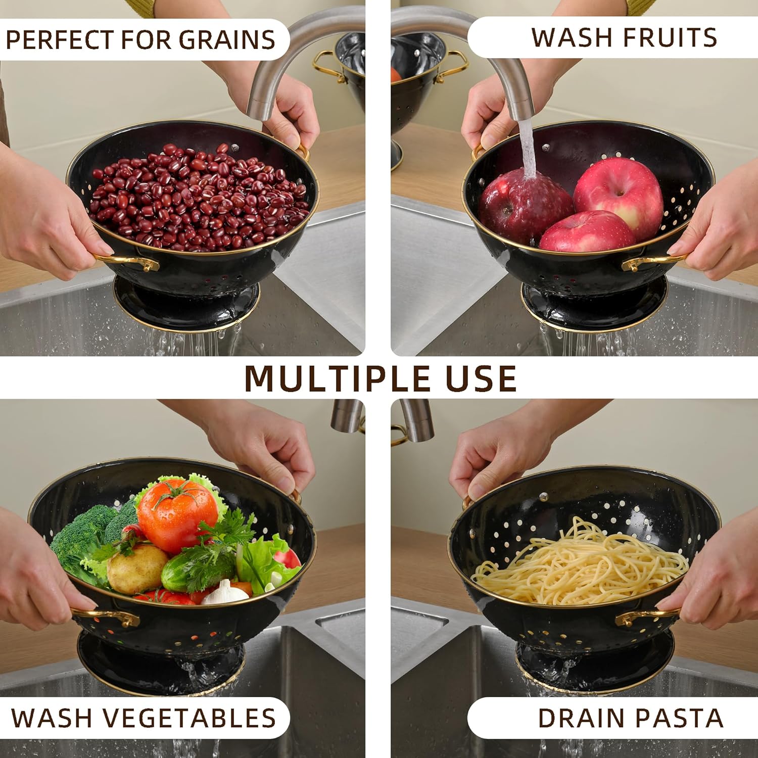 - (The colour is a glittery black, which is a very unusual colour and contains glitter, not a flaw!) 2 Different Sizes : BeFare kitchen colander set include 3-Quart and 5-Quart, it's available for daily and party use, and it could be a good decoration as well.