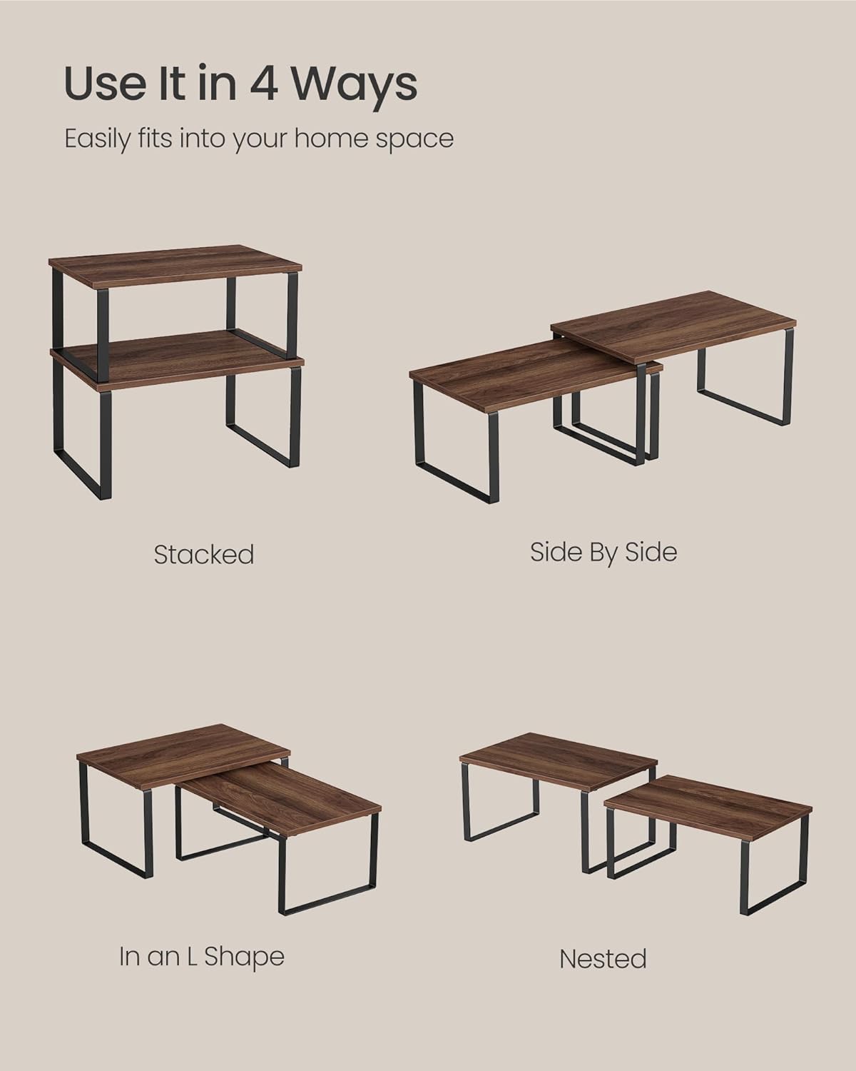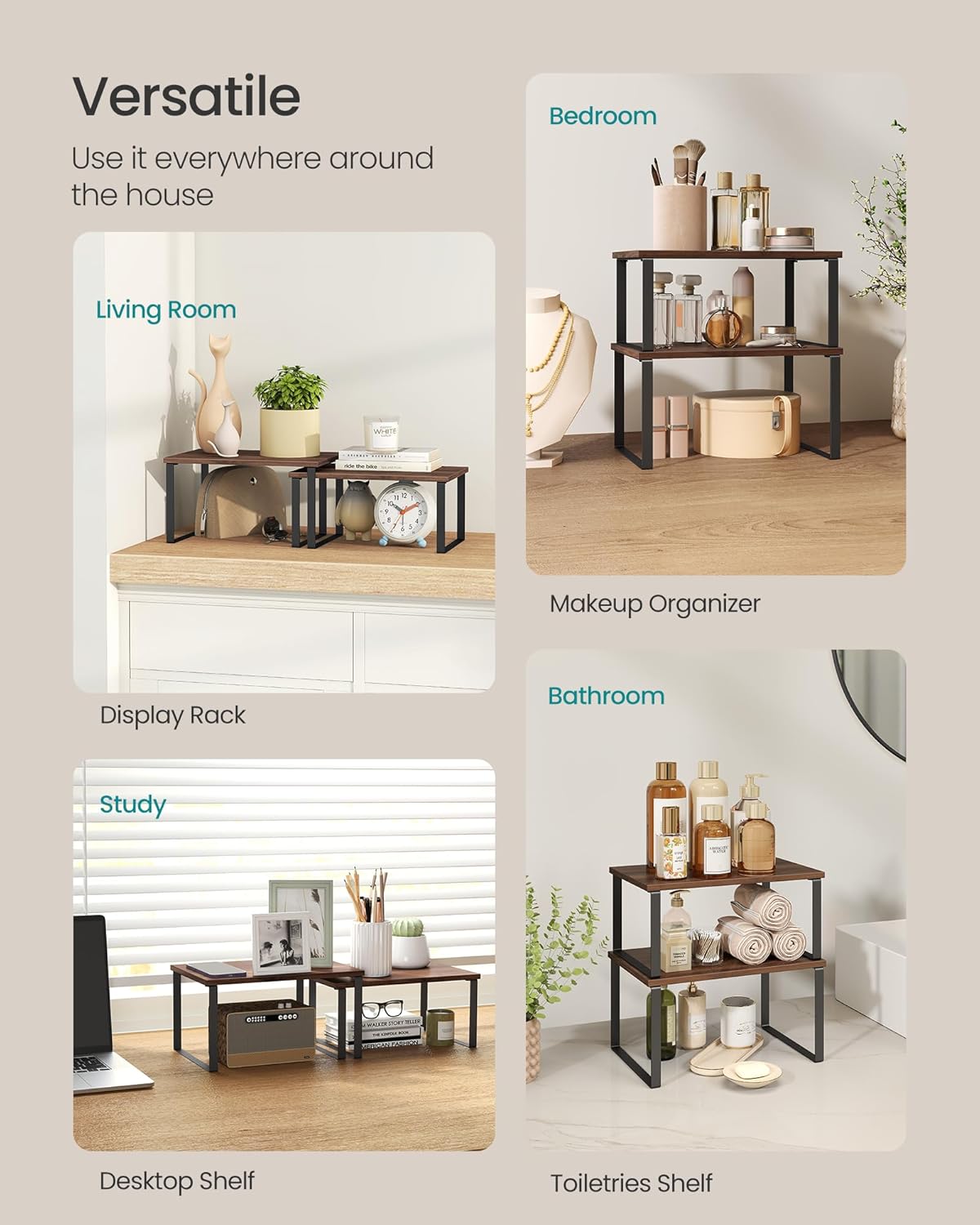 SONGMICS Cabinet Organizer Shelf, Set of 2 Kitchen Counter Shelves, Kitchen Storage, Spice Rack, Stackable, Expandable, Metal and Engineered Wood, Natural Walnut and Matte Black UKCS020K01