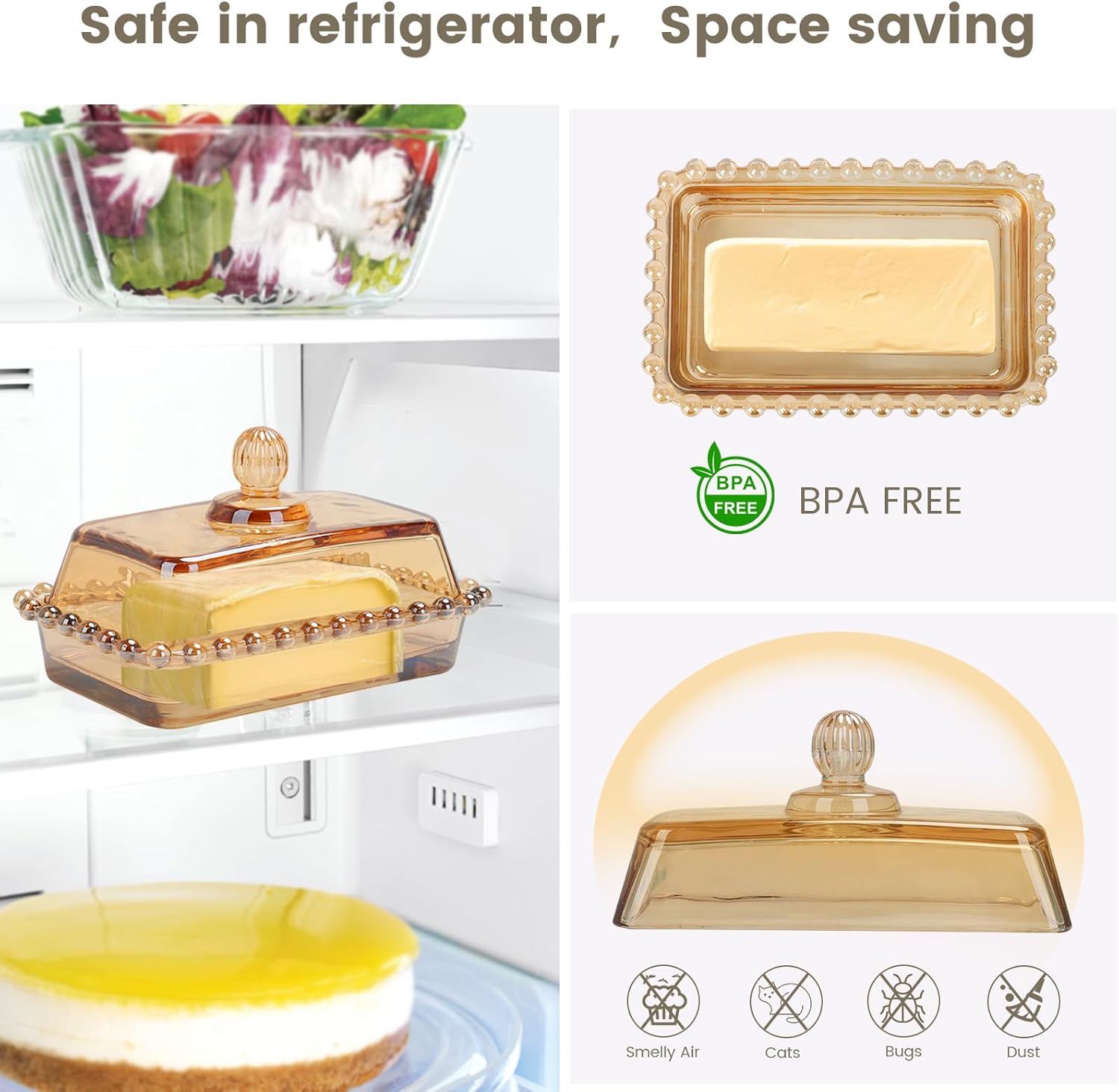 Glass Butter Dish with Lid for Countertop Amber Vintage Crystal Butter Holder for Counter,Covered Glass Butter Keeper on Counter Butter Tray for Refrigerator(Amber)