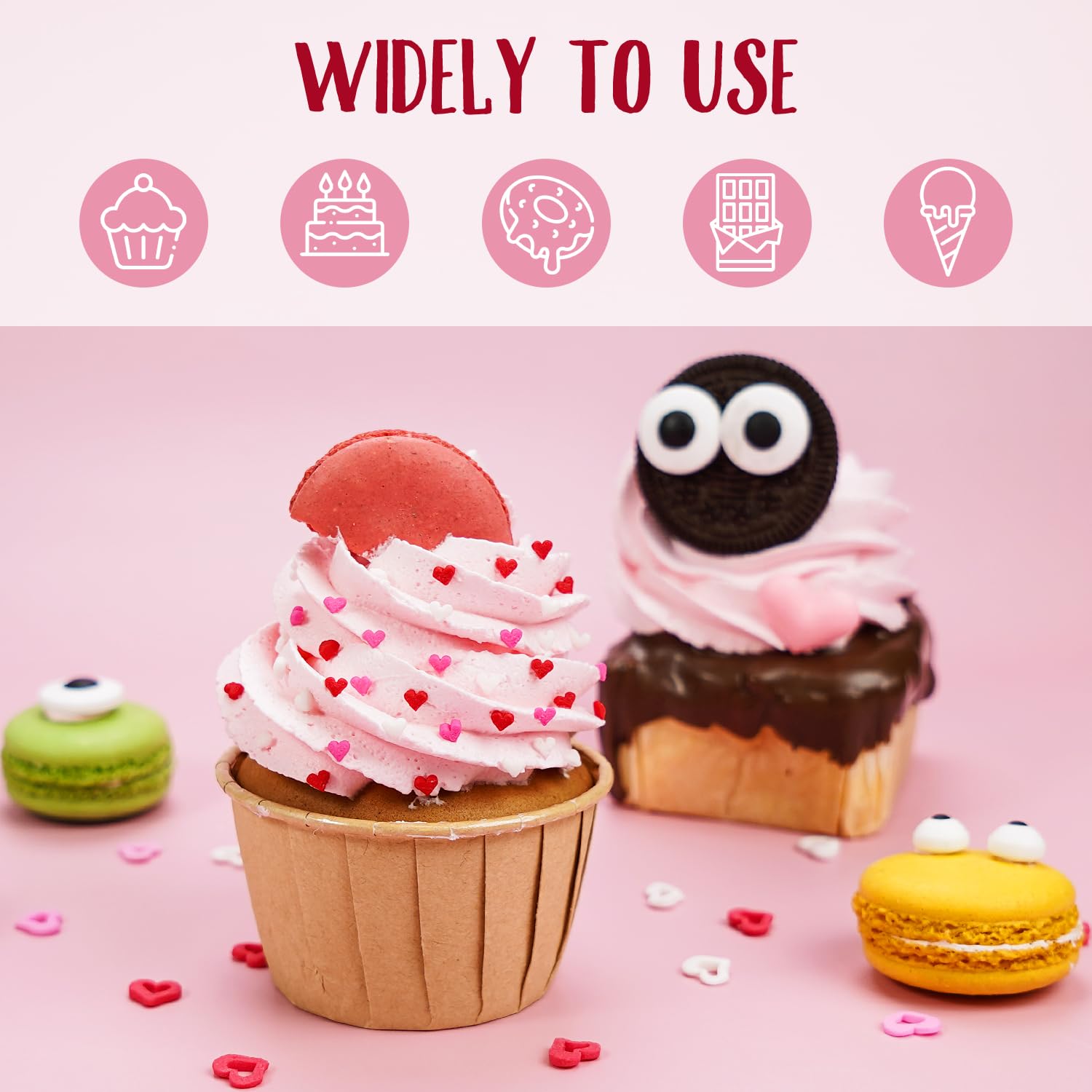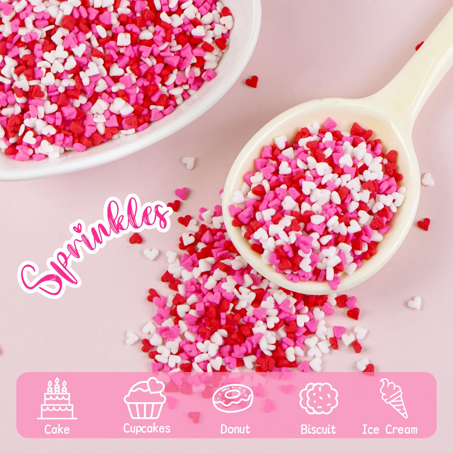 - Edible Mini Hearts Sprinkles are a mix of white, red and pink. They can add a festive atmosphere to your desserts, make baking more fun, and even beginners can easily use them. Whether used on cupcakes, chocolates, cookies, cakes, ice cream, milkshakes, they can be perfectly matched to make desserts more delicious and dazzling.