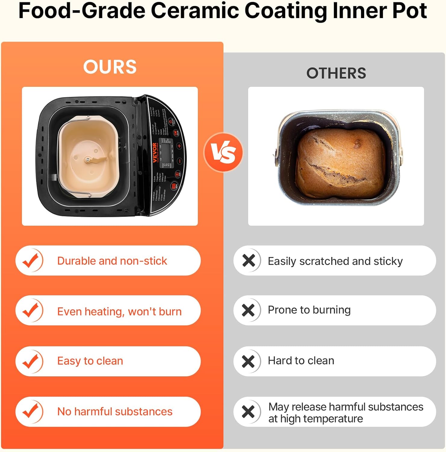 - Food-Grade Ceramic Inner Pot: The inner pot is crucial for your health and safety. We use a food-grade ceramic inner pot, which is heat-resistant and will not release harmful substances. It is durable, non-stick, and the coating is not easy to peel off, ensuring no burning even after prolonged use. The mixing blade is also made of food-grade Teflon material, which is safe and harmless. Every baking process takes care of your health, ensuring peace of mind with every bite.