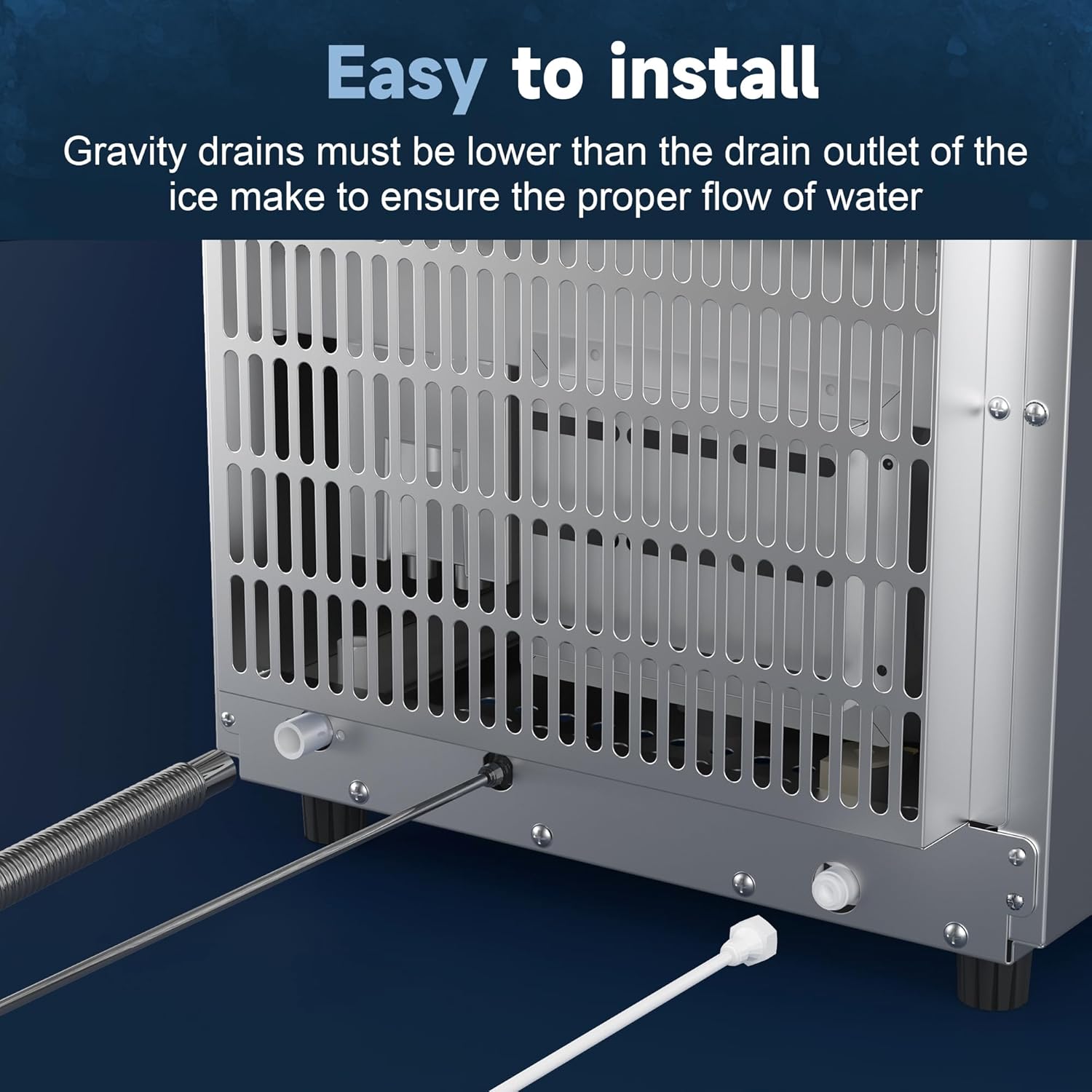 - Direct Drainage, No Leaking: A gravity drain.Your selection of one will be based on the installation location. You’ll need to connect the water line to the kitchen water supply and run the drain hose into the floor drain before plugging the machine in. If you need to use an external pump to drain water, please purchase the pump yourself and make sure the pump is below the floor level of the ice machine.