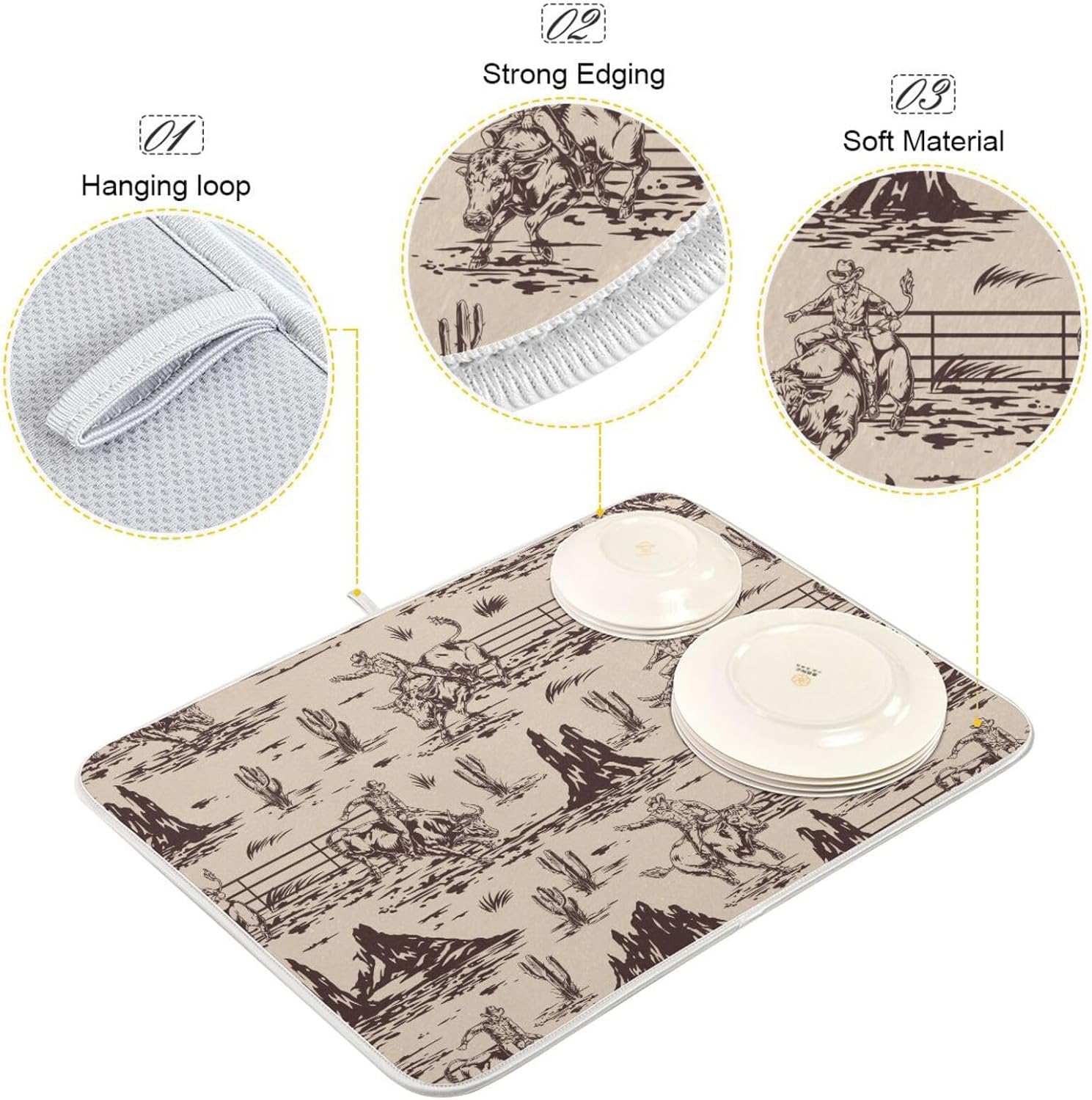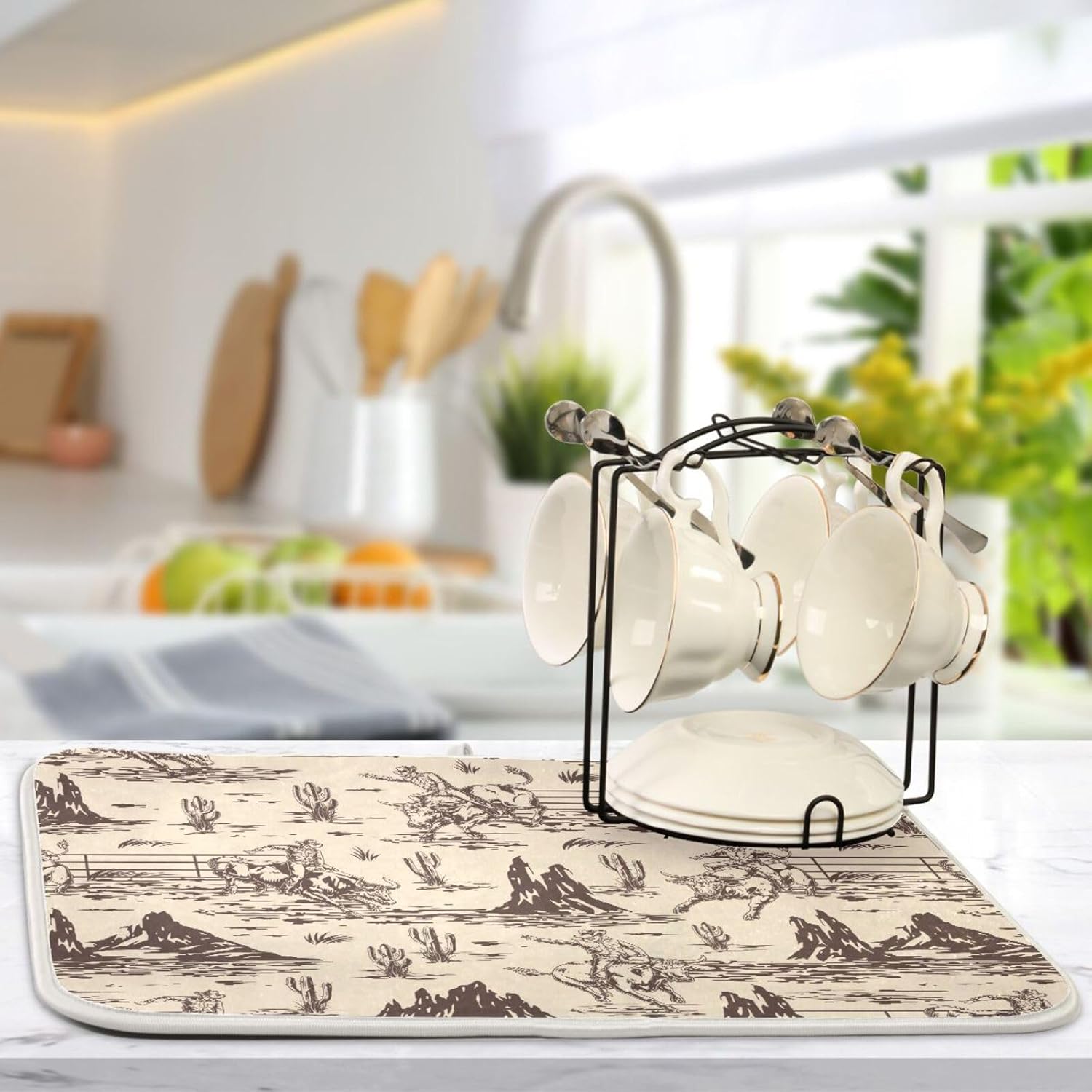 West Cactus Cowboy Dish Drying Mat for Kitchen Counter Absorbent Microfiber Drying Pad, Large 18x24 in, Reversible Drainer Mats
