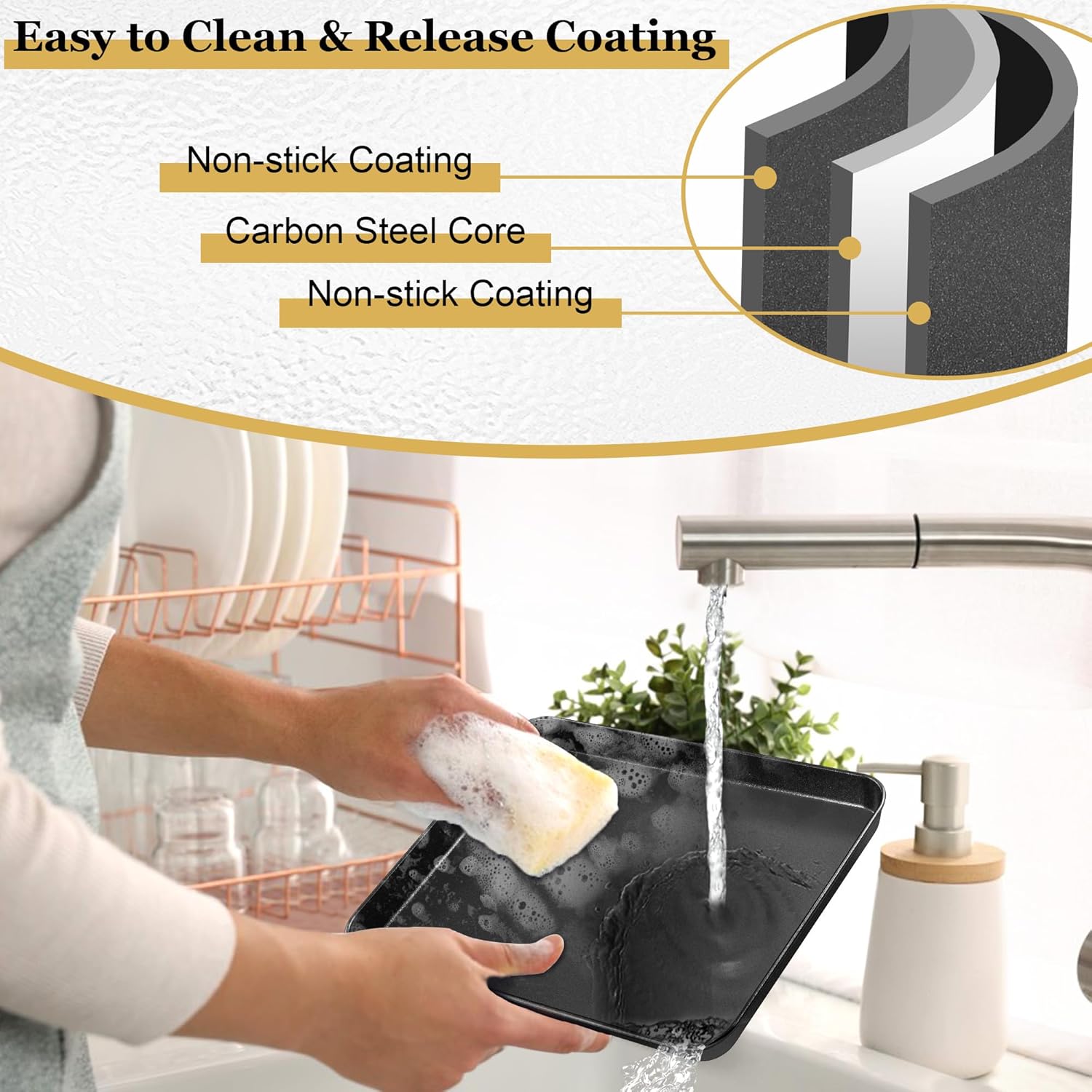 - MAKE CLEANING A BREEZE: One-piece design metal baking tray with smooth surface and no rough spot, Round corner with no dead end make baked food come out perfectly and completely, Non-stick coating can easily release food and no more concerns in food sticking problem, Can easily rub the dirty away, Dishwasher safe for effortless, Recommend to wash by hand for longer service life