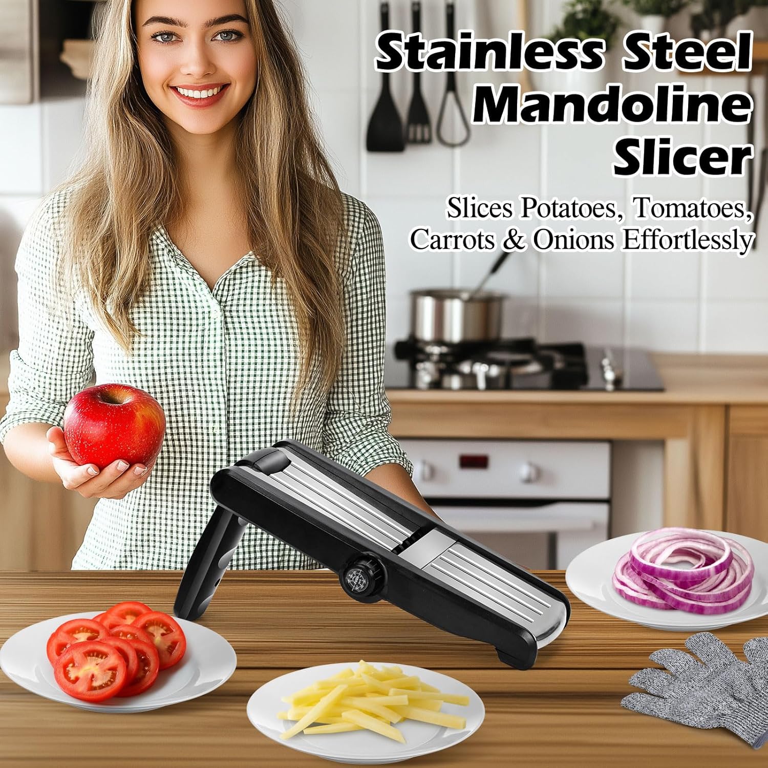 - 【3 Adjustable Blades】Our mandoline slicer features adjustable thickness settings, allowing you to slice vegetables and fruits at 3mm, 6mm or 9mm thicknesses. It also offers 3-9mm julienne options. Whether you’re preparing thin slices for garnishes or thicker ones for baking, this versatile mandoline slicer meets all your needs. Its stainless steel construction ensures durability and precision, making it a ideal kitchen tool for home cooks.