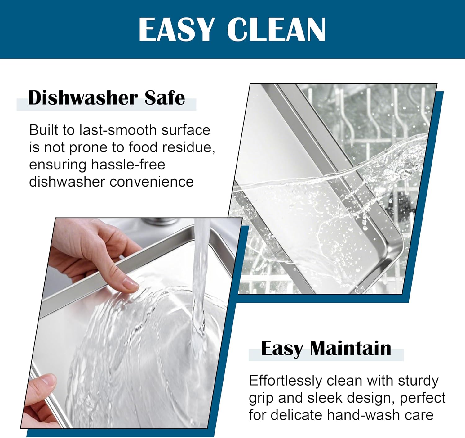 - EFFORTLESS CLEANING: Polished surface is smooth and burr-free for a comfortable grip, Resists stains and grease from sticking, 1 Inch deep rims prevent spills, Stackable design ensures compact and organized storage, Dishwasher safe and easy to clean by hand, Ideal for busy households