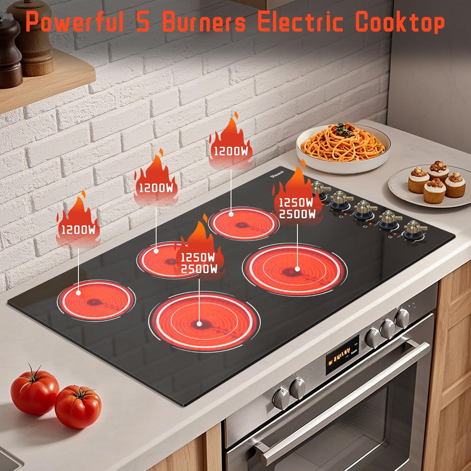 Electric Cooktop 36 Inch - 5 Burner Electric Stove Top with 8400W, 36 Inches Built-in Ceramic Stove with Two Dual Rings, Overheat Indicator, Knob Control, 220V - 240V Hard Wired (No Plug)