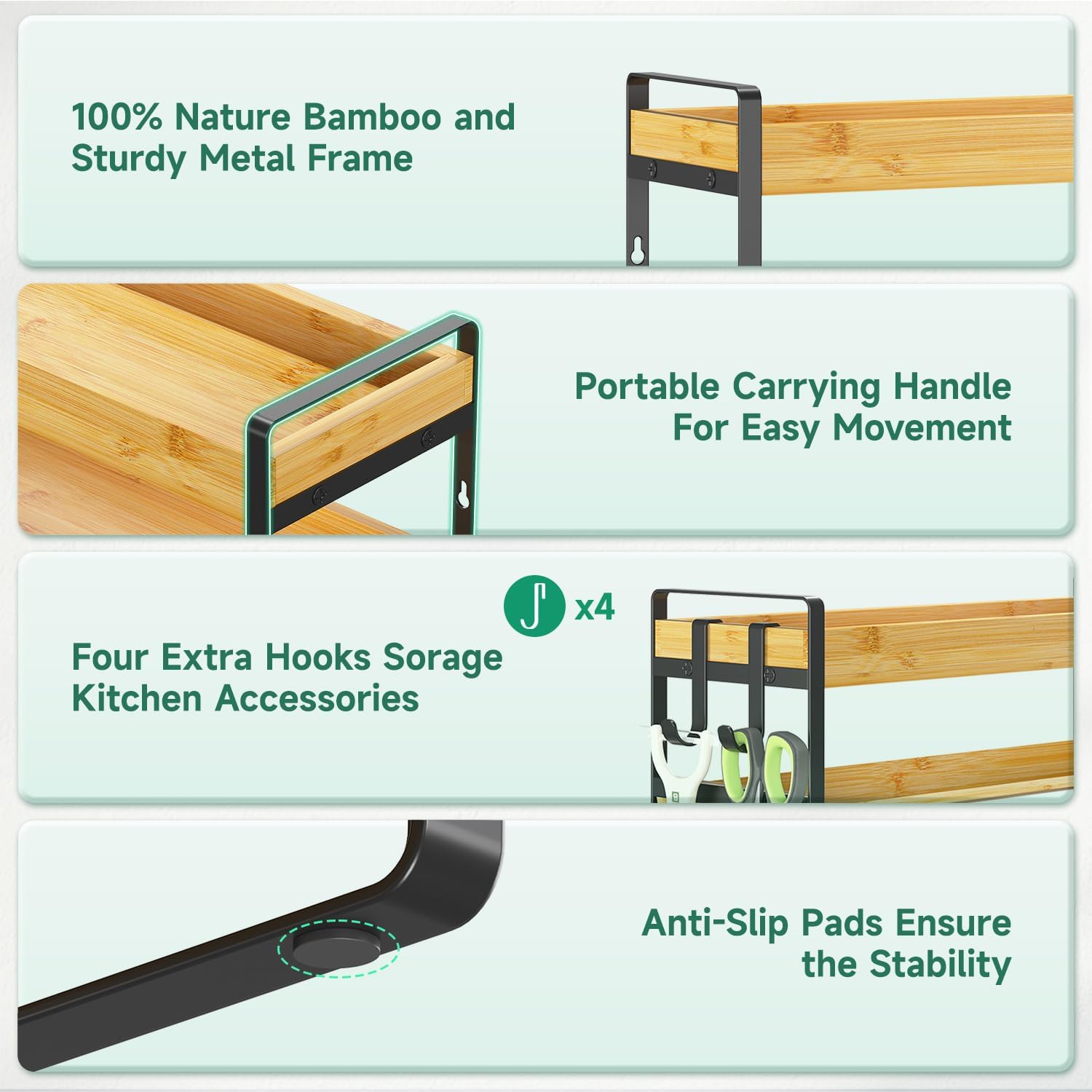 EsLuker.ly Spice Seasoning Rack Organizer Kitchen Countertop, 4 Tier Bamboo Spice Shelf Holder Storage with 4 Hooks, Wall Mounted Freestanding Stand for Pantry, Quick Spice Access(Jars Not Included)