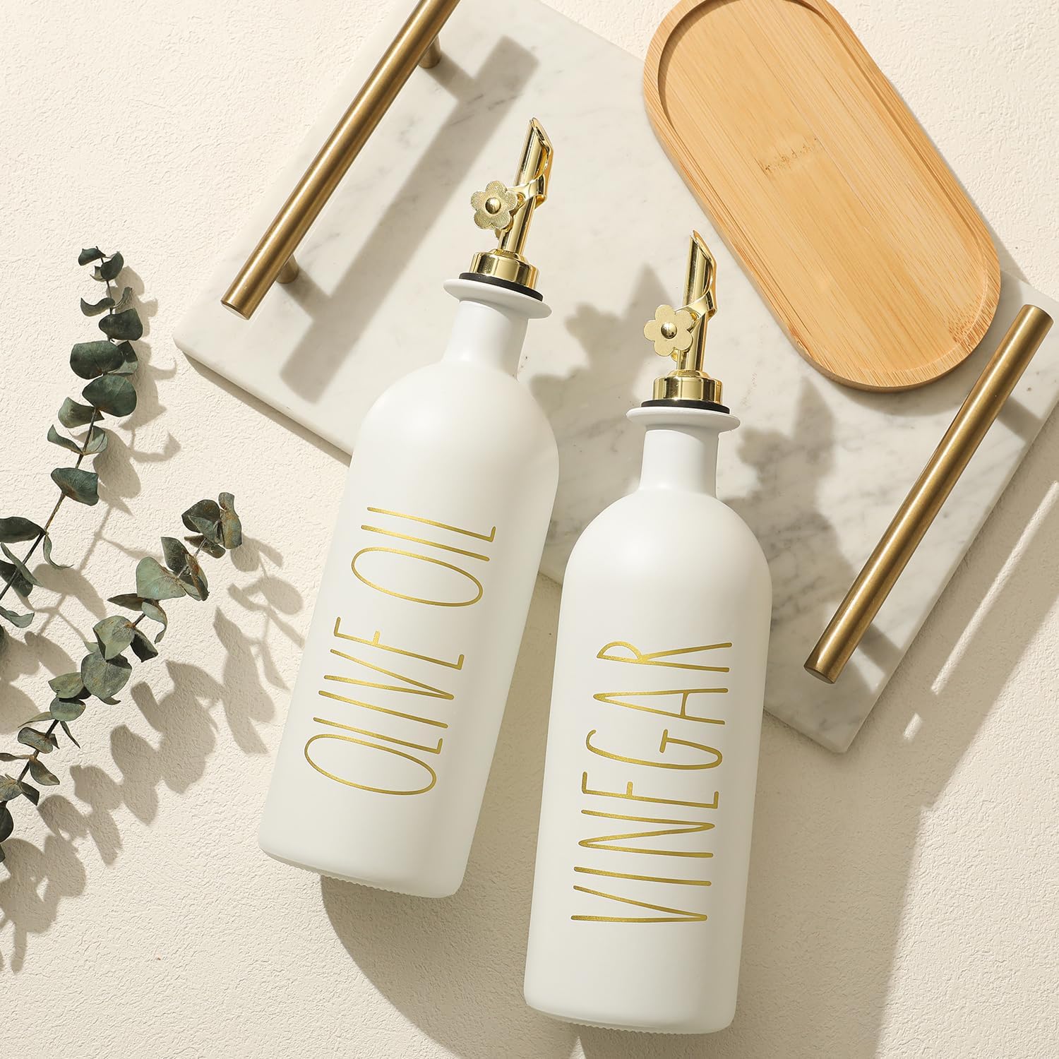 - KITCHEN OLIVE OIL DISPENSER BOTTLES – The oil and vinegar dispenser set contains 2 white 16oz (500ML) glass bottles, 2 gold stainless steel oil spout and a bamboo tray, Ideal for safely store and dispense your olive oil and vinegar.