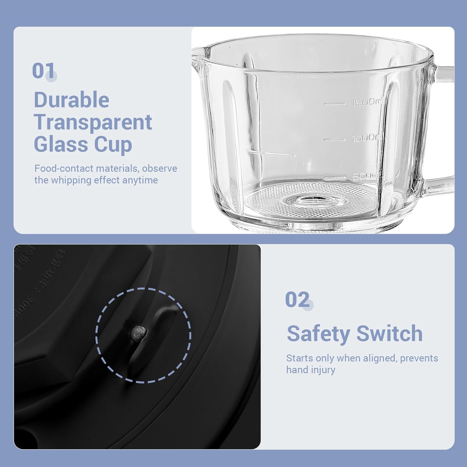 - Safety Notes : The food processor is designed with a safety protection switch. It can only be started after being aligned to prevent accidental injury to your hands. The operation time of the machine is preferably less than 15 s, and the usage interval should be more than 1 minutes to ensure the normal operation and service life of the motor. When cleaning, please do not wash the main unit with water to avoid damaging the electrical components.