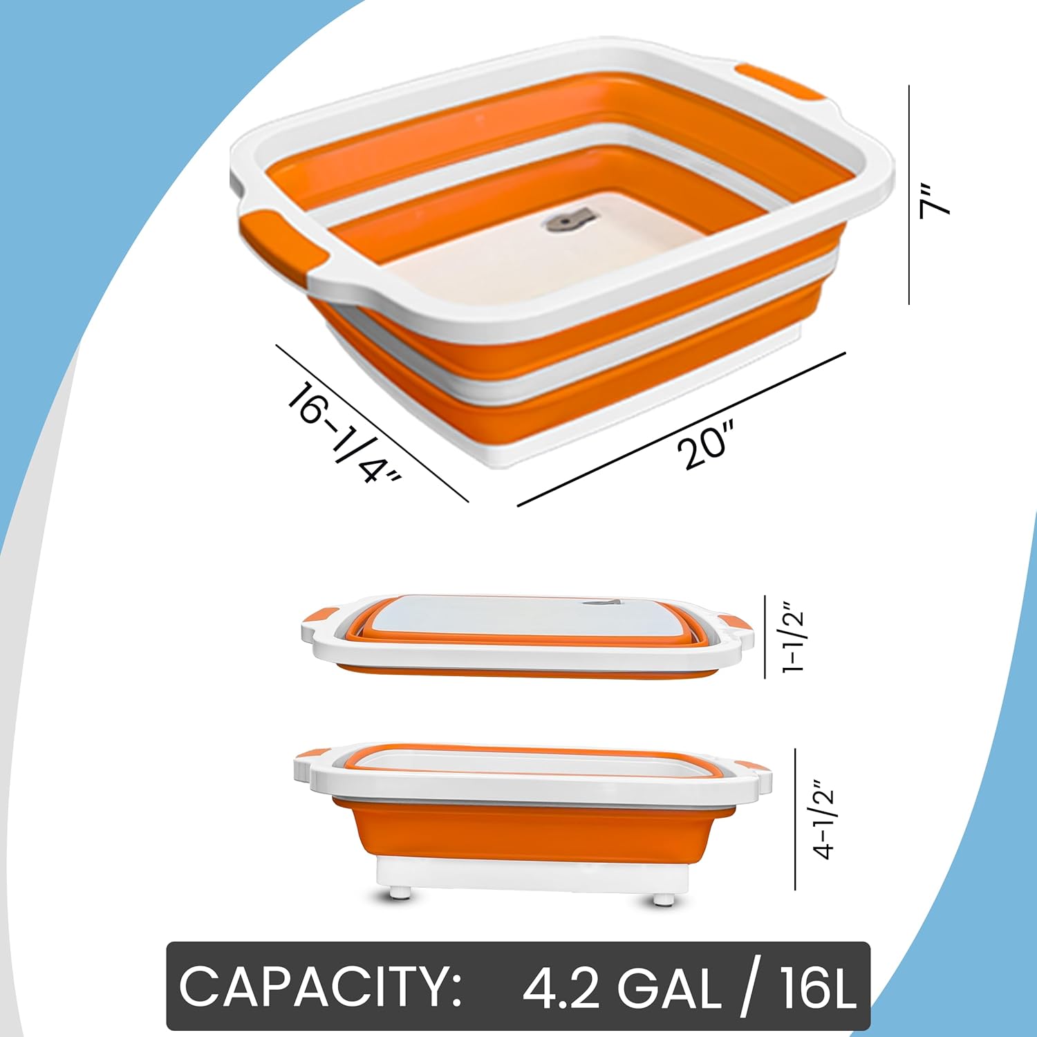 - MULTI-PURPOSE POP UP TUB: This collapsible dish wash bin or meat marinating container is versatile and handy for many different uses. This dish tub for kitchen sink or marinating container with lid can be used as a camping sink for washing dishes and utensils in camper, a fruit washing basin, cutting board for vegetables, fruits and meat. For kitchen an ideal washbasin for a single sink, a cutting board with lid for gathering garden veggies, for hand-washing laundry, collapsible bowl for food storage, for soaking tired feet, for bathing cats, for carrying water to clean walls and toys, or as a sick bucket for storing garbage.