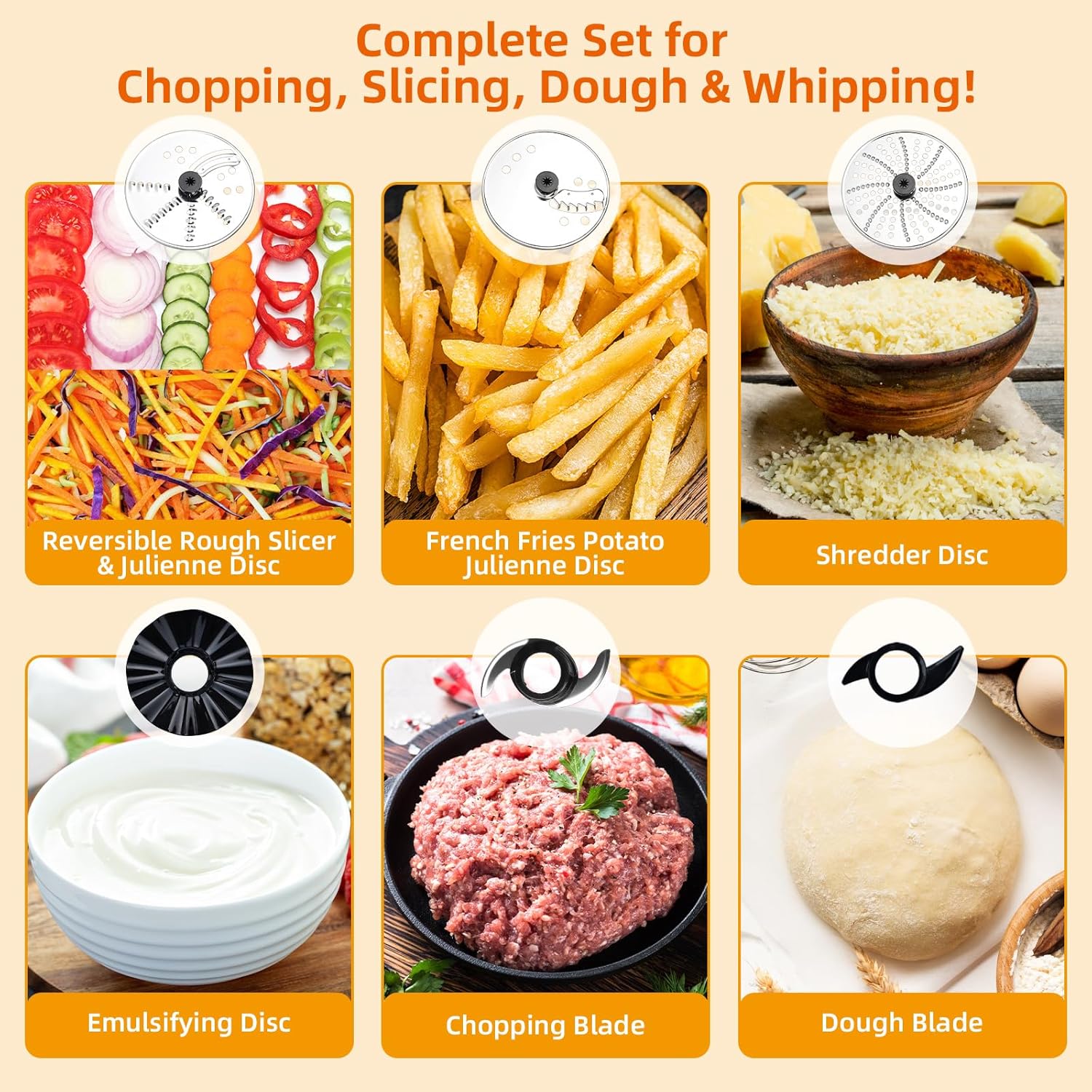 - 【8-in-1 Multifunctional Food Processor for Every Need】From chopping veggies to kneading dough and whipping cream, this Homtone food processor does it all! Includes 6 premium blades: a stainless steel S-blade for chopping, a dough blade, a slicer& julienne discs, and a whisk attachment—making it a true all-in-one kitchen helper.