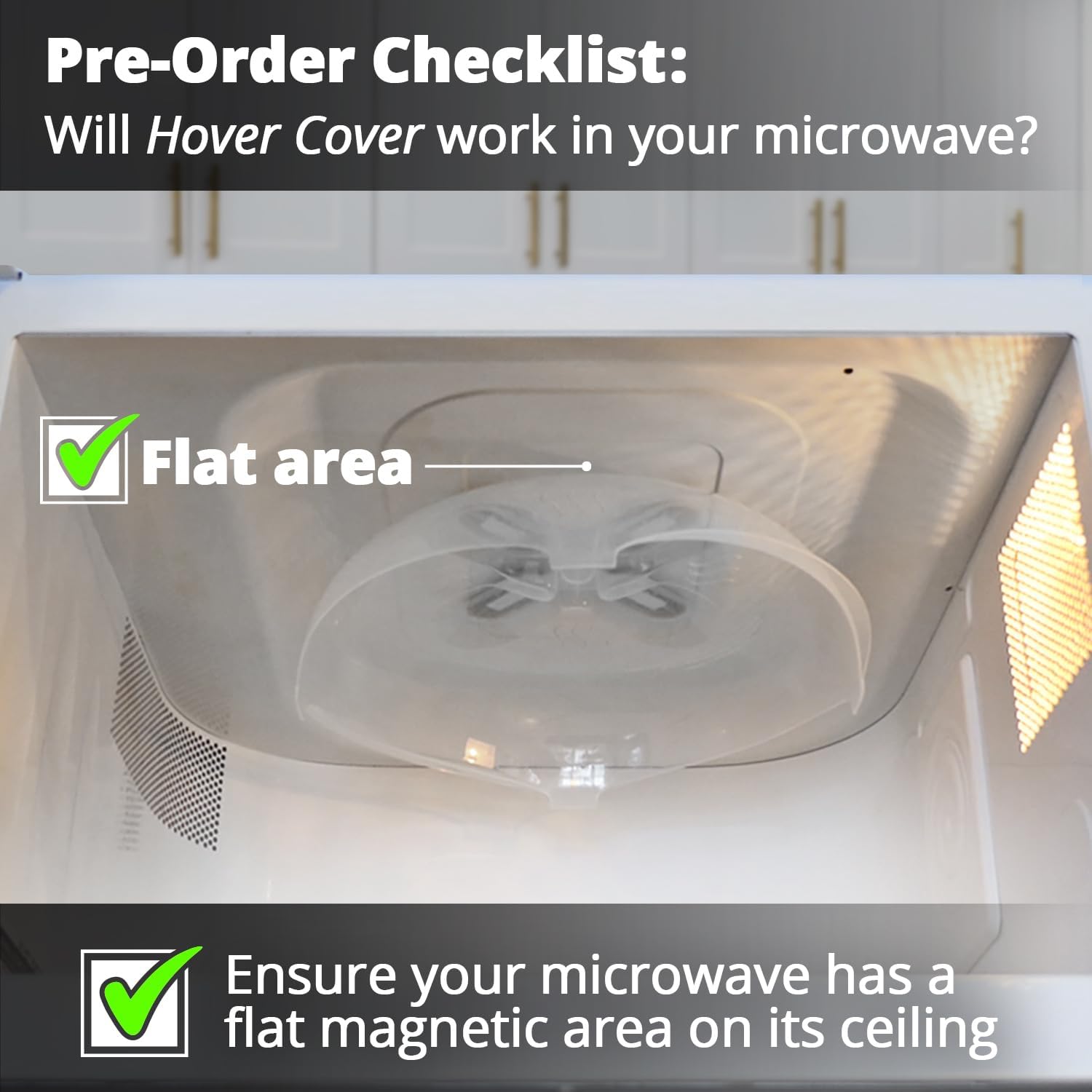 - PLEASE CHECK BEFORE ORDERING - Designed to work with standard microwaves, microwave-safe plates and bowls. To avoid returns, watch our Pre-Order Compatibility Video. After watching, check your microwave for a flat metal ceiling or use a magnet to ensure the magnetic microwave dish cover will stick. NOTE: this specific model of Hover Cover measures 12 x 11 x 3.25 inches. Compatibility is based on typical model features and may vary. Please verify your microwave’s interior before purchase to ensure a proper fit.