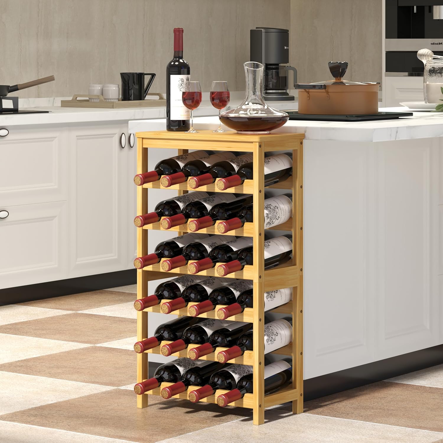 6 Tier Wine Rack Freestanding Floor, 24 Bottles Wine Storage Shelves with Table Top, Stackable Wine Display Rack for Kitchen, Bar, Dining Room, Natural Bamboo Finish