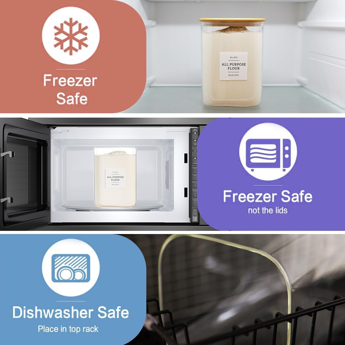 - 【DISHWASHER AND MICROWAVE SAFE】Heat-resistant up to 120°C, safely usable in microwaves for reheating. Compatible with freezers for versatile food storage. The large glass jar with lid is made of glass, and it is easy to wash, simply wash it under warm water or throw them in the dishwasher. The bamboo lid can be wiped with cloth.