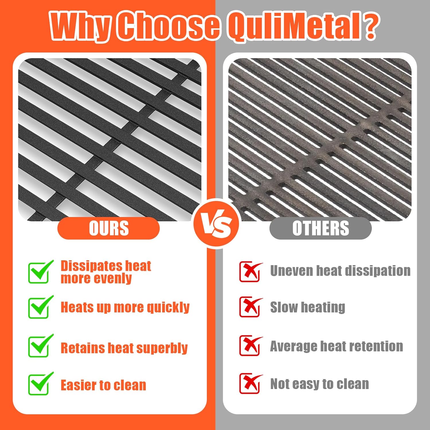 - đ„ăSUPER HEAT PRESERVATIONă Cast iron grills are hotter than porcelain grills, have better grilling effects, and bake more evenly. The unique material properties enable cast iron grills to quickly form a high-temperature environment, leaving a clear mark on the surface of food! The perfect combination of cast iron grills + porcelain steel flavorizer bar provides cooks with a better temperature control experience and professional-grade grilling effects