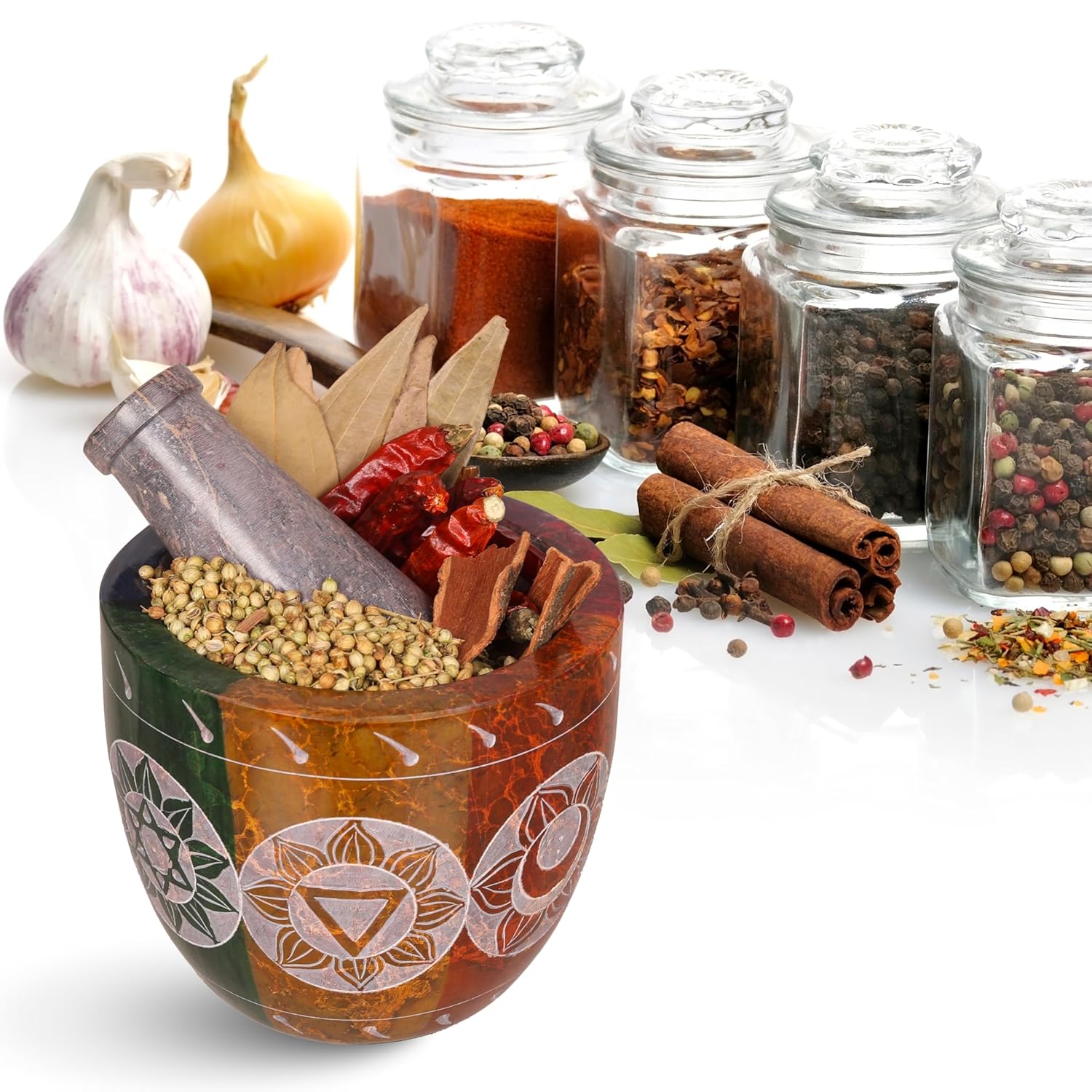- CLASSIC DESIGNING: The outer polished surface engraving makes it look trendy and exotic when placed on the shelf of your kitchen. The inner part of the mortar is rough that provides an excellent surface for dry and wet mixing. The pestle is made in such a manner that it makes full contact with all the ingredients and bring out the hidden flavors that are usually missed with machine- grinding. It comes with a broad and narrow end, both of which can be used depending on the purpose.