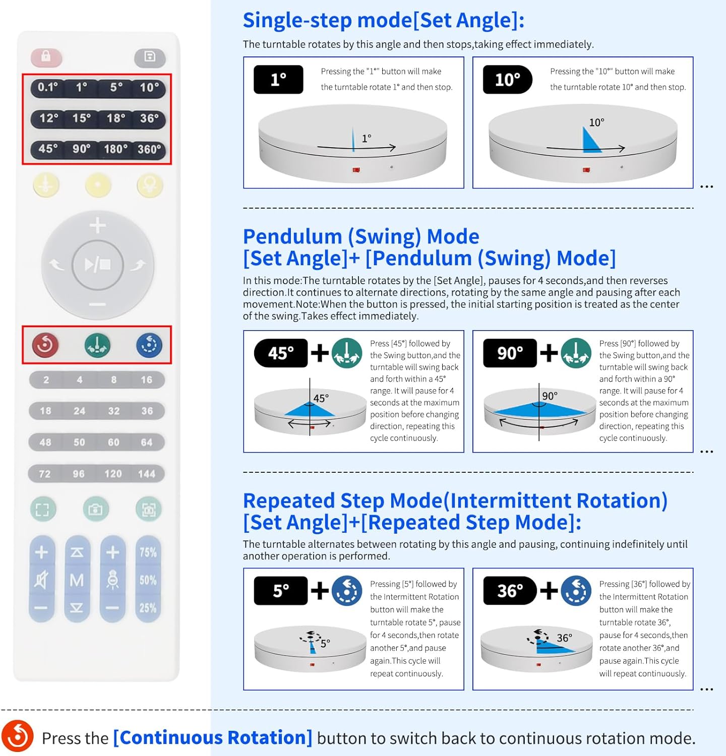 - 【The Electric Turntable Supports five rotation modes】: 【Continuous Rotation Mode】for Live Video Show.【Single-Step Mode】for Product Display and Live Demonstration.【Repeated Step Mode】 for Automated Product Display .【Multi-step Within One Circle Mode】for 360-Degree Multi-Angle Photography and 3D Scanning. 【Pendulum (Swing) Mode】 for Automatic Multi-Angle Front-and-Back Product Display. The intelligent multi-step within one circle mode makes shooting more streamlined and automated