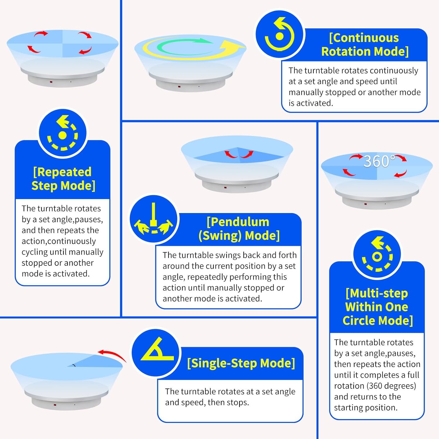 - 【The Large motorized turntable Supports five rotation modes】: 【Continuous Rotation Mode】for Live Video Show.【Single-Step Mode】for Product Display and Live Demonstration.【Repeated Step Mode】 for Automated Product Display .【Multi-step Within One Circle Mode】for 360-Degree Multi-Angle Photography and 3D Scanning. 【Pendulum (Swing) Mode】 for Automatic Multi-Angle Front-and-Back Product Display. The intelligent multi-step within one circle mode makes shooting more streamlined and automated
