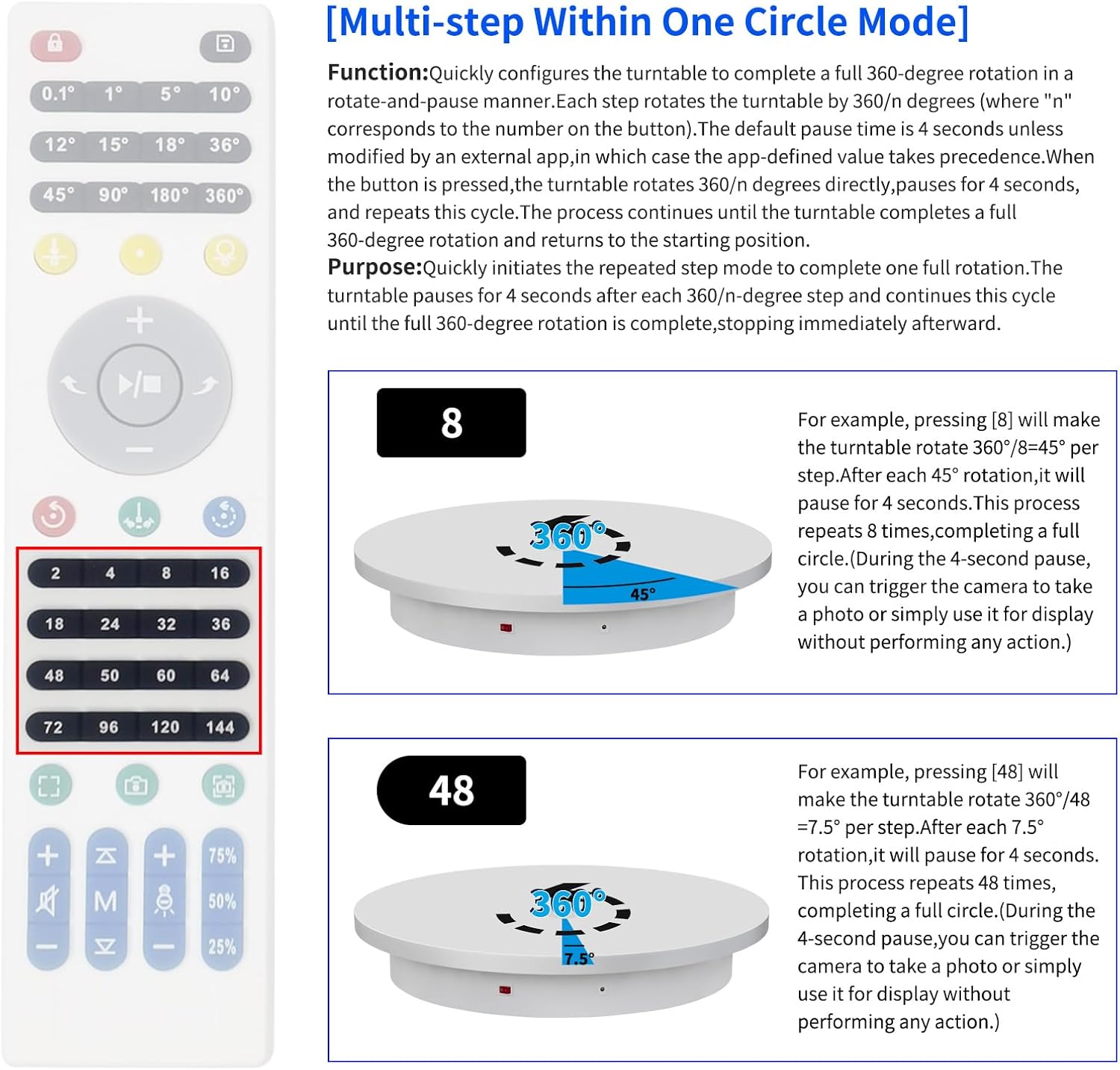 - 【This Large Turntable includes a Professional Flagship Remote Controller】:Precise angle settings and user-friendly combination key design enable support for a wider range of applications. Support: Set the current position as the origin point (used in conjunction with the "Return to Origin" button). Support: Save the current settings to the turntable's internal flash. More versatile angle buttons and mode button combinations provide greater flexibility for various applications