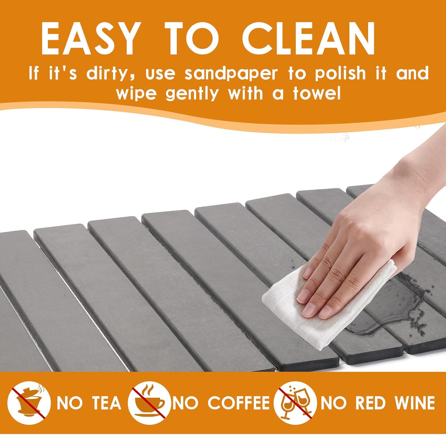 - 【QUICK DRYING & SUPER ABSORBENT】Stone bath mat Made of natural diatomaceous earth, it can quickly absorb the water of tableware and dry quickly, effectively solving the problem of wet water on your kitchen countertop or bathroom surface, so that the countertop always stays dry and odor-free
