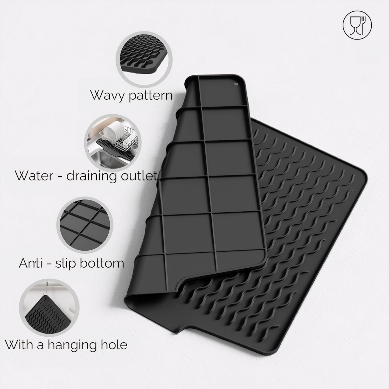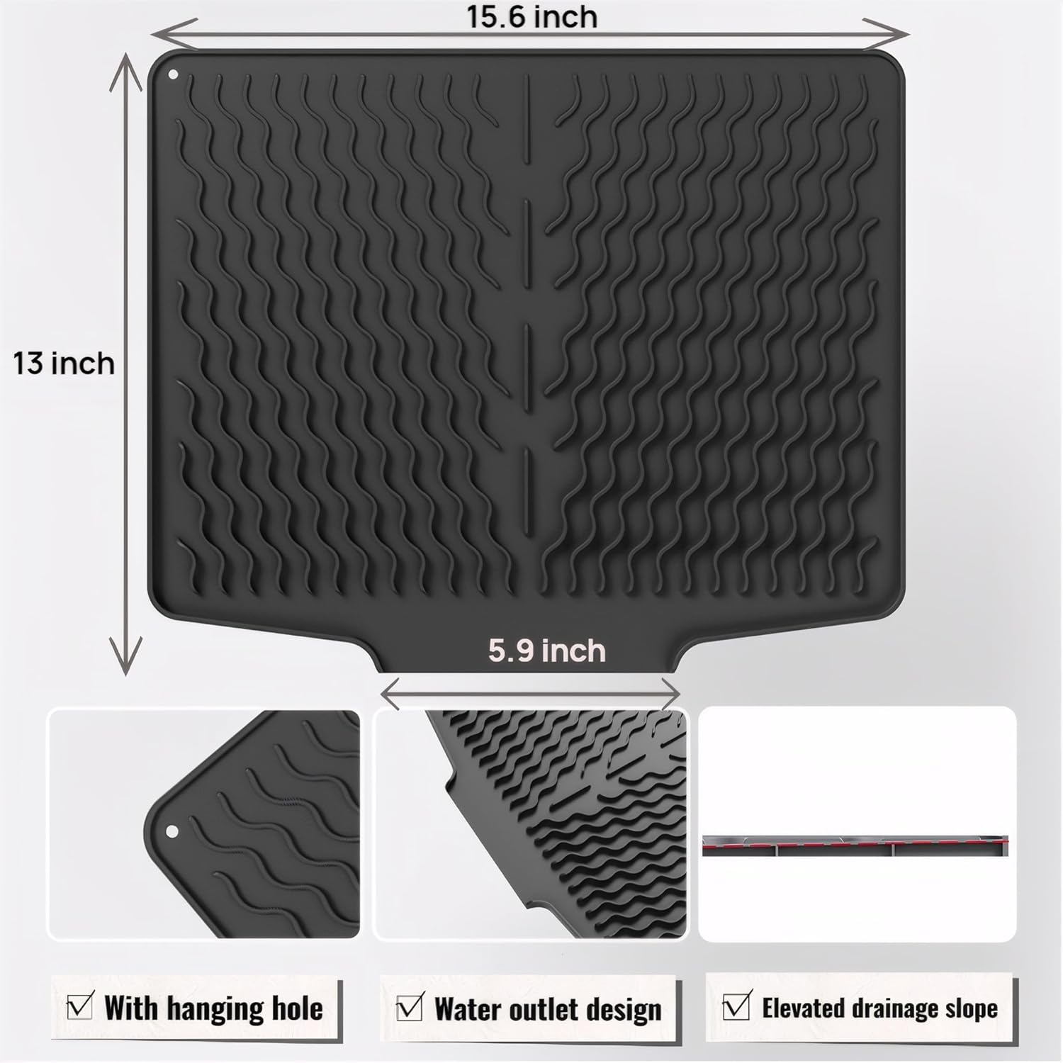 Dish Drying Mat with Drain, Silicone Mat for Kitchen Counter, Non-Slip Drainer Mat for Kitchen Sink, Countertop Dish Drying Rack, Heat Resistant Kitchen Accesories(Black, 15.6"x13")